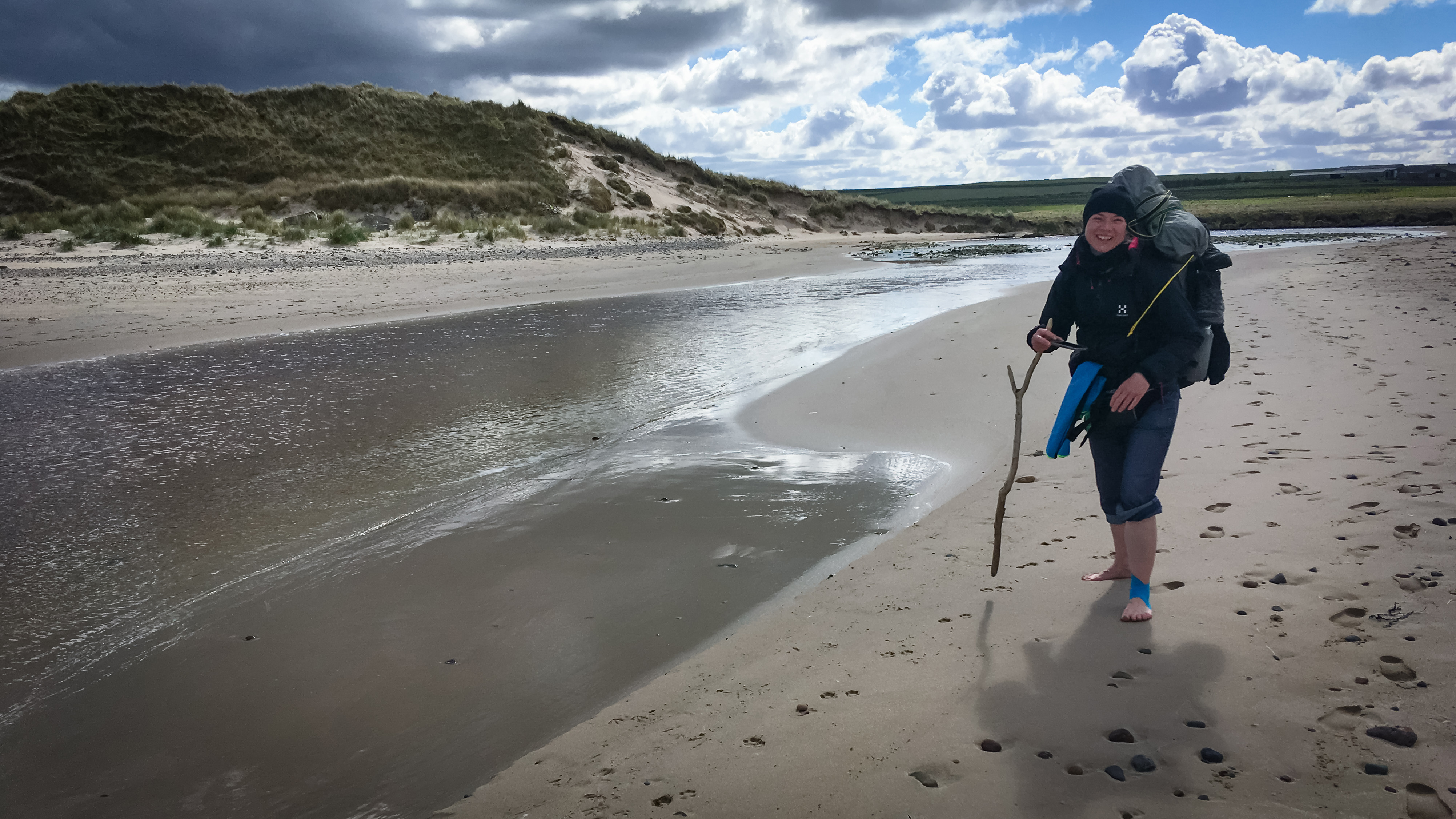 Das Wasser war erfrischend kalt und wir gehen noch eine Weile mit unseren nackten Füßen durch den Sand. Gerade als wir unsere Schuhe wieder an den Füßen haben, sehen wir einen Wanderer genau die gleiche Stelle überqueren, seine Schuhe anziehen und sofort weiterziehen. Wir lassen und Zeit und schauen wieder einmal zurück, denn die Sicht ist so gut, dass man sogar Noss Head noch erkennen kann.
