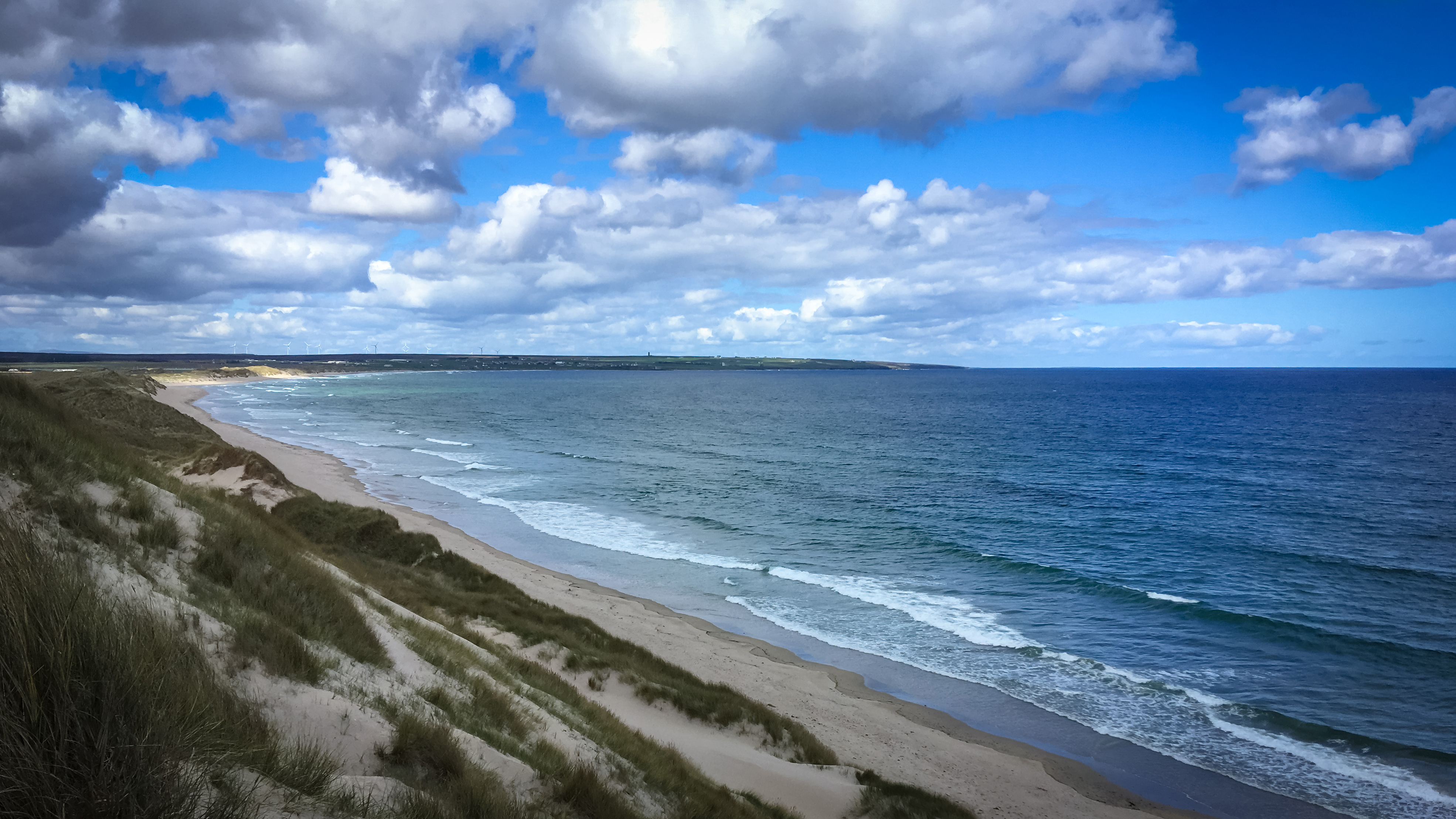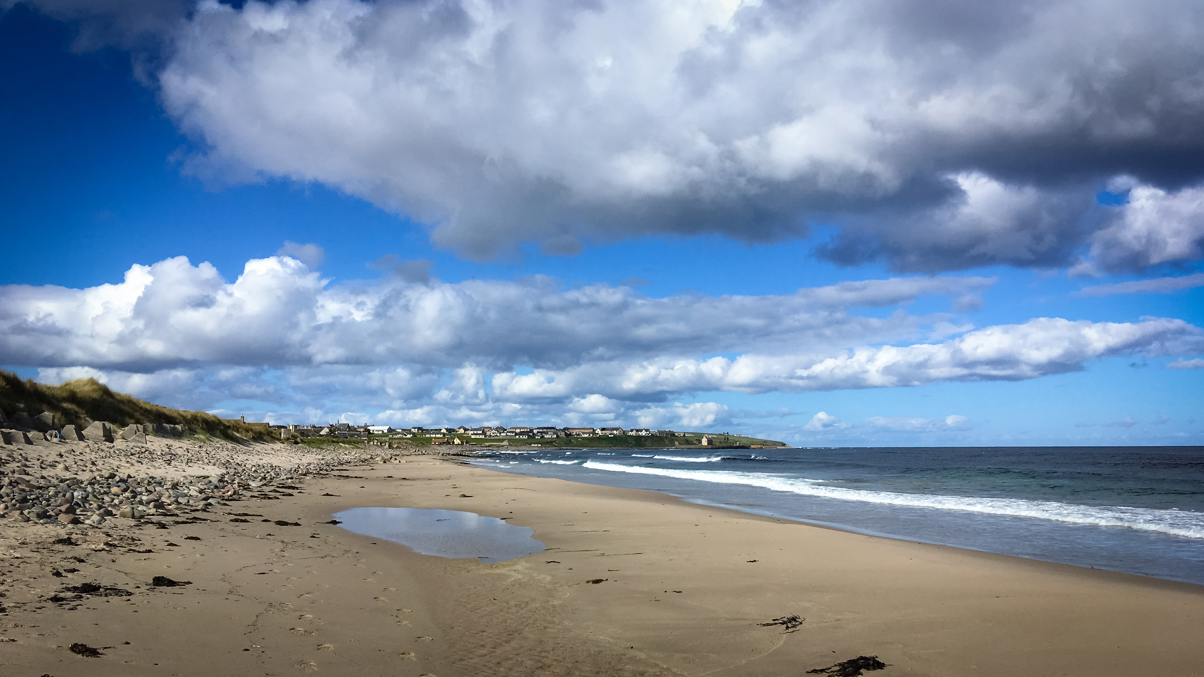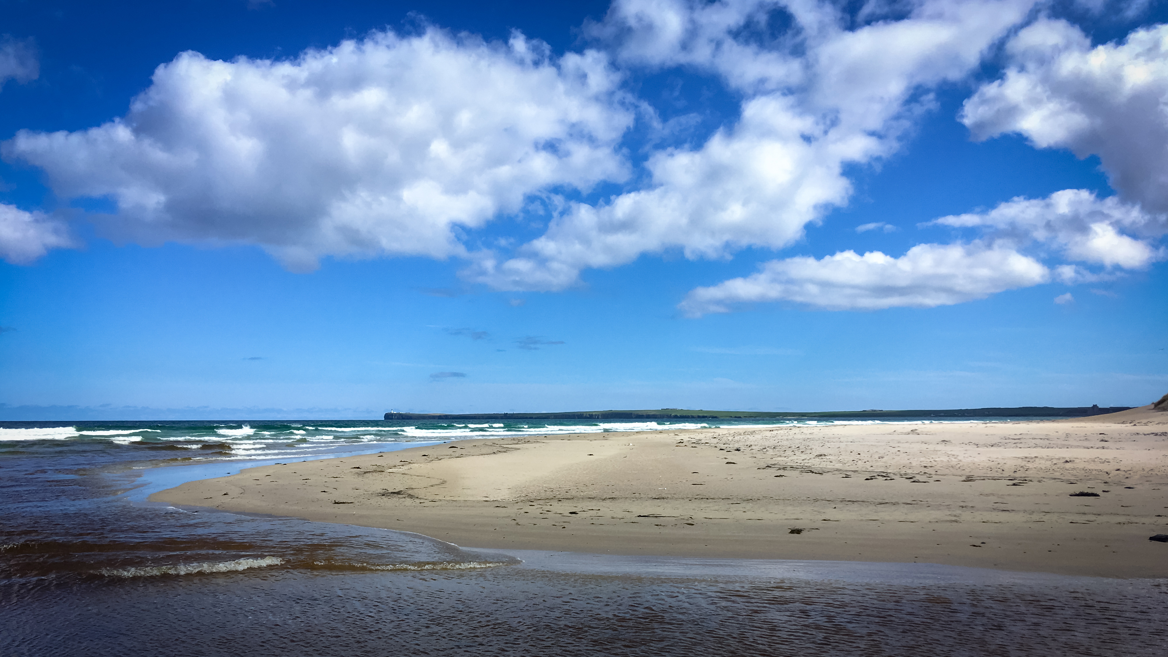 Unser Ziel Keiss liegt direkt gegenüber auf der anderen Seite der Sinclair Bucht, um dorthin zu gelangen müssen wir noch über die in der Sonne weiß schimmernden Strände. Der Himmel ist strahlend blau, nur wenige weiße Wolken treiben tiefhängend ihre Schatten über Landschaft und Meer. Wo die Sonnenstrahlen auf das Meer treffen verändern sie in ständigem Wechsel die Farbe des Wassers. Von tiefgrün bis fast azurblau, mit glitzernden Diamanten auf den Wellen.