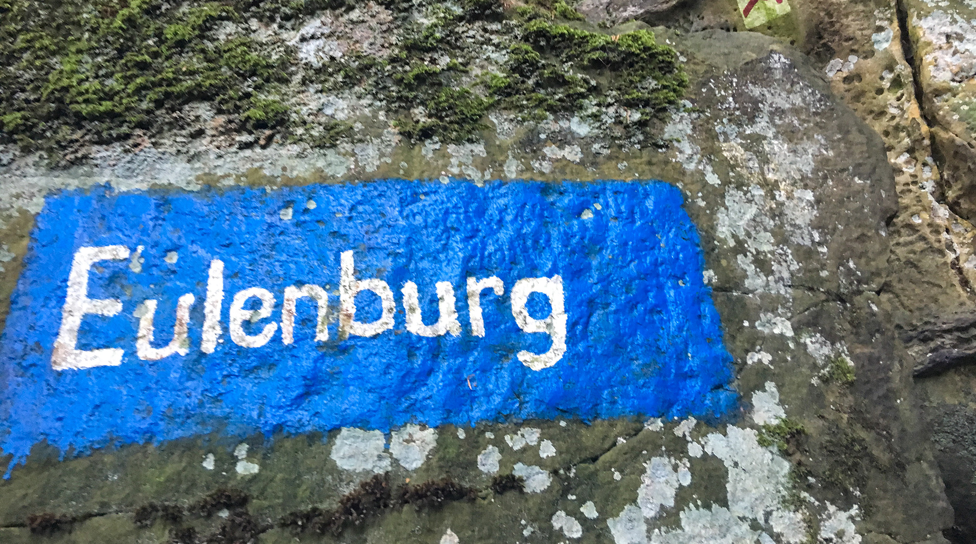 Am Heringer Millen und zwei oder drei Häusern und dem Campingplatz vorbei geht es weiter an der „Schwarzen“ Entz vorbei. Das mit dem Schwarz vor Entz habe ich in der Heringer Millen gelernt. Es sind wieder einige Menschen hier, die sich um den Bereich eines kleinen Wasserfalls tummeln. Wir verlassen die Menge und gehen über die Straße und auf schmalen Pfaden steil hinauf in den Wald. Es dauert nicht lange und wir kommen wieder an beeindruckenden Felsen vorbei. Zuerst die Felsschlucht Eulenburg, oder Eileburg.