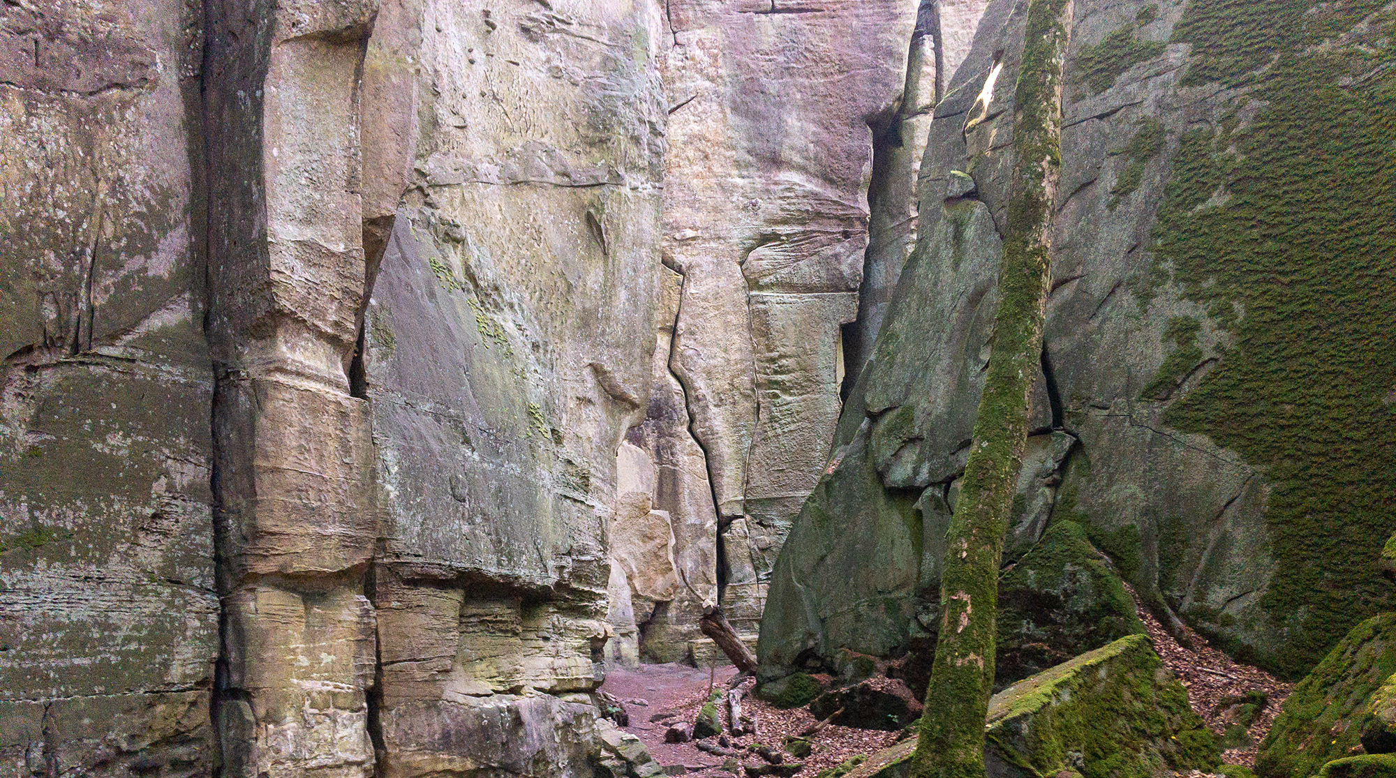 Es geht stetig ein wenig bergauf, rechter Hand hört man immer wieder Autos auf der nahen Straße in Richtung Berdorf. Dann geht der Weg sogar zwischen den Felsen hindurch! Oder besser gesagt durch tiefe Spalten! Wir erreichen eine Felsformation an der „Labyrinthe“ steht.