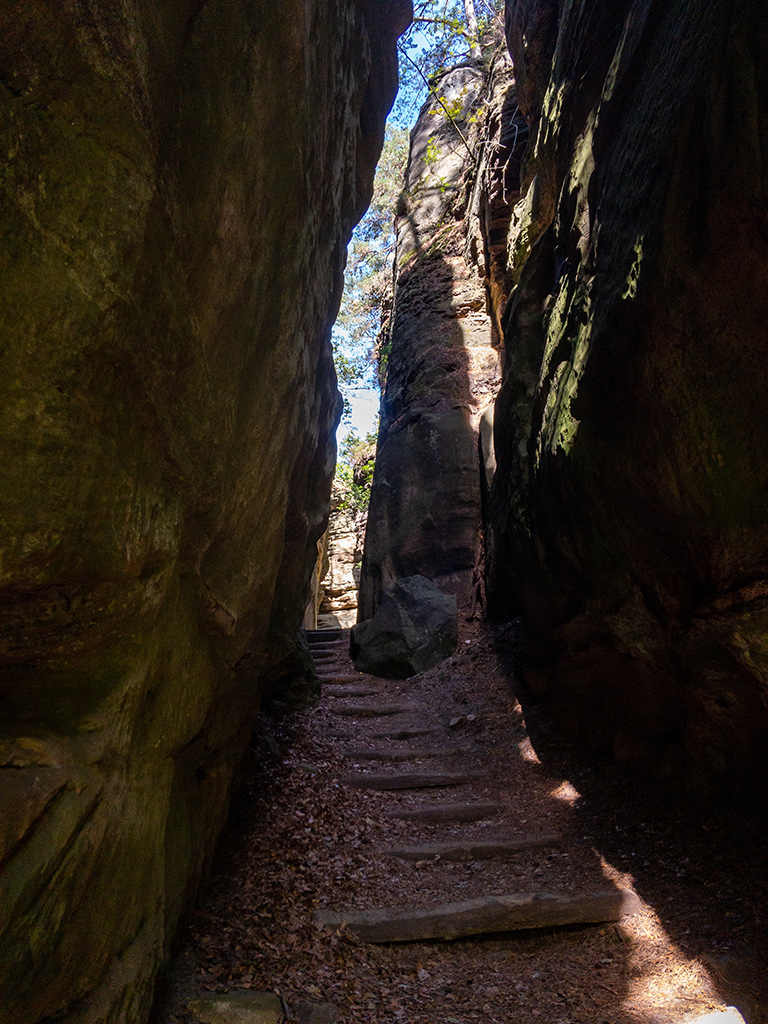 Am Pereskop gehen wir vorbei, die Leitern sind nichts für Mozart. Jetzt fließt ein Bach, den man immer wieder über Brücken queren muss, und mein Höhepunkt ist die Pietsch-Kummer Höhle, in der merkwürdige, kreisrunde Ausschnitte in den Felsen gehauen wurden. Später habe ich nachgelesen, dass hier Mühlsteine für die Region gebrochen wurden.