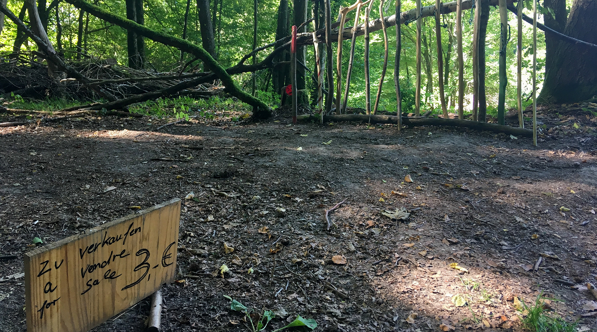 Aus der Ferne sehe ich ein Schild auf dem Waldboden stehen. Neugierig gehe ich darauf zu und schaue mir an was hier angeboten wird. Geschnitzte Wanderstöcke! Eine Dose für das Geld steht auch daneben. Die schönen Stöcke aus Buchenholz hat sicherlich ein Kind geschnitzt und teilweise mit Bändern zum Greifen versehen. Ein langer, dünner Stock gefällt mir ganz besonders. Allein für die Idee würde ich gerne eine kleine Summe spenden, aber ich habe nur einen Schein im Portemonnaie. Vielleicht kann ich am letzten Tag noch einmal hierher zurück gehen und den Stock kaufen.