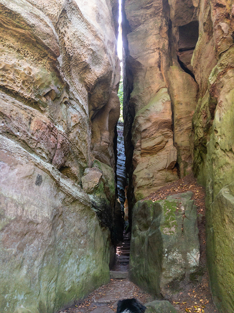 Ein Schild weist auf eine Umleitung. Zwei junge Wanderer kommen aus dem gesperrten Gebiet, es ist anscheinend doch begehbar, aber wer weiß wie begehbar für Mozart! Also nehme ich die Umleitung, die im Wald am Rand der Felder entlangführt. Irgendwann geht es abwärts und wir treffen wieder auf den Original Weg. Direkt geht es eine steile Treppe hinab in Richtung einer gewaltigen Felsformation.