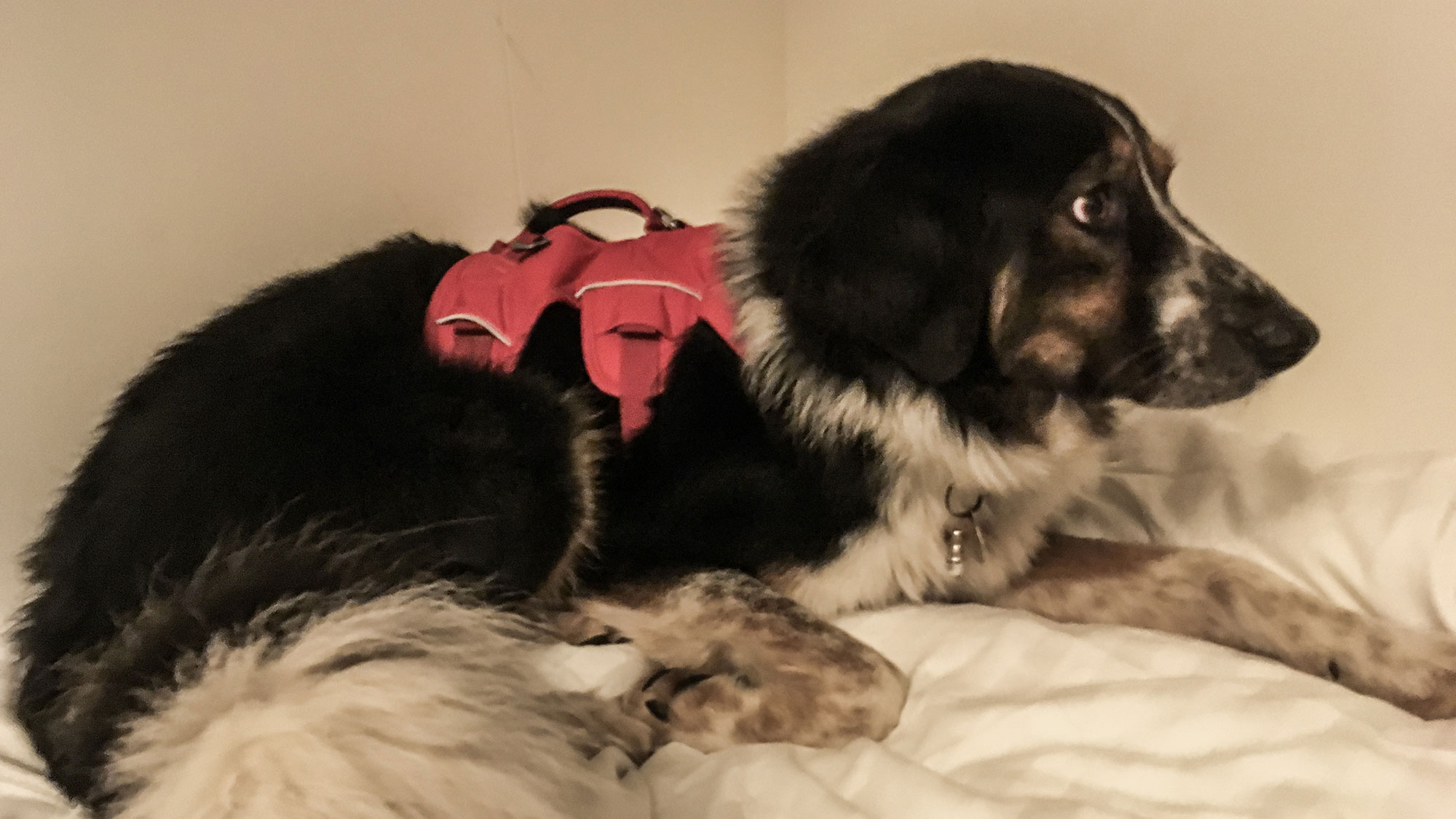 Mozart trägt seinen eigenen, knallroten Rucksack und macht das auf den mit Menschen überfüllten Bahnhöfen ganz prima. Insgesamt 3x mussten wir bis Drihuis umsteigen, der letzten Haltestelle vor dem Hafen. Es gibt zwar einen Pendelbus von Amsterdam zum Hafen, aber laut telefonischer Auskunft der DFDS sind Hunde auf den Bussen nicht erlaubt. Tja, dann gehen wir eben, und in Newcastle werde ich versuchen irgendwie mit den Öffis zum Bahnhof zu kommen. Aber noch sind wir in den Niederlanden und bis zum Hafen schlappe 5-6 km Fußweg.