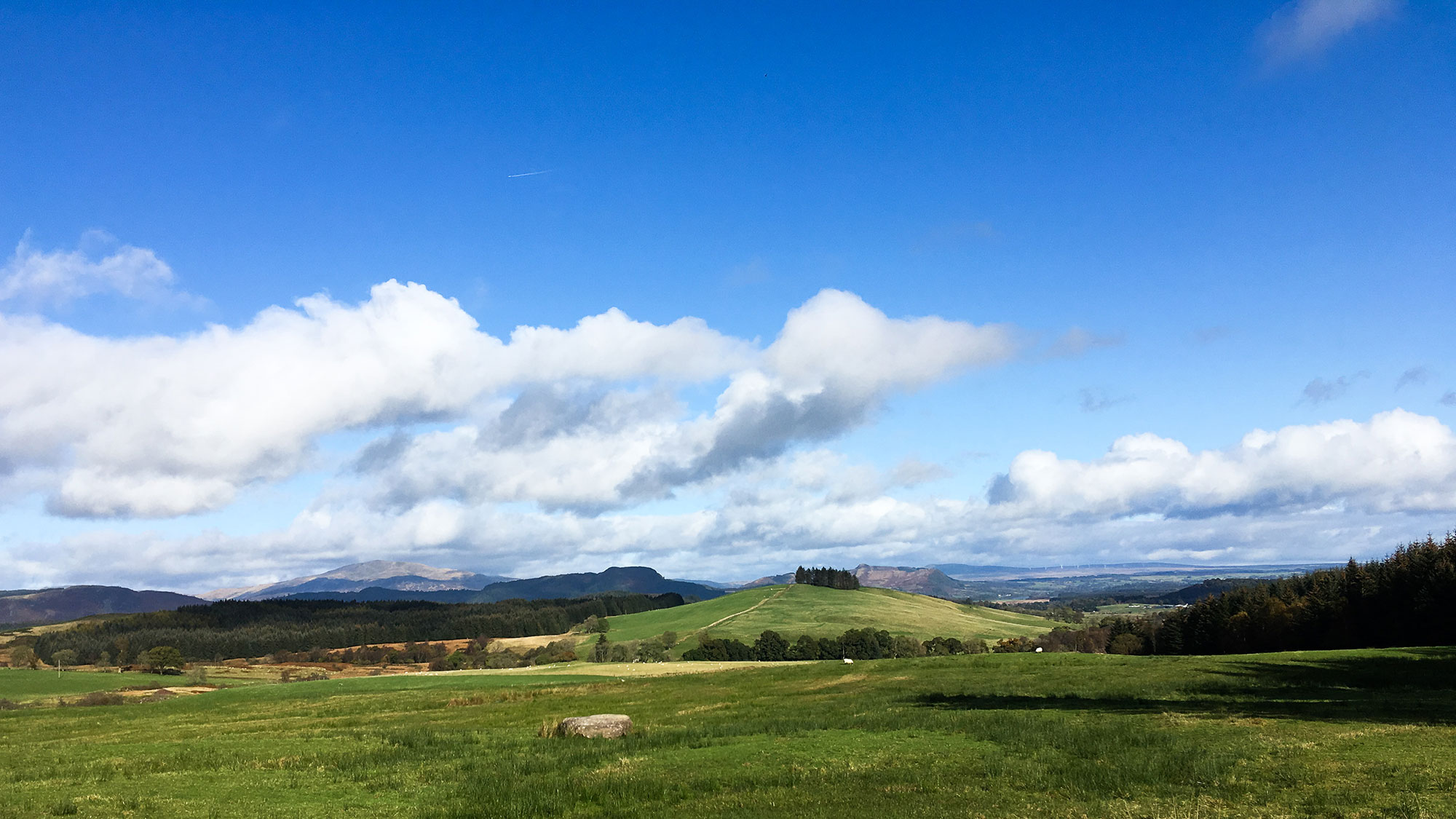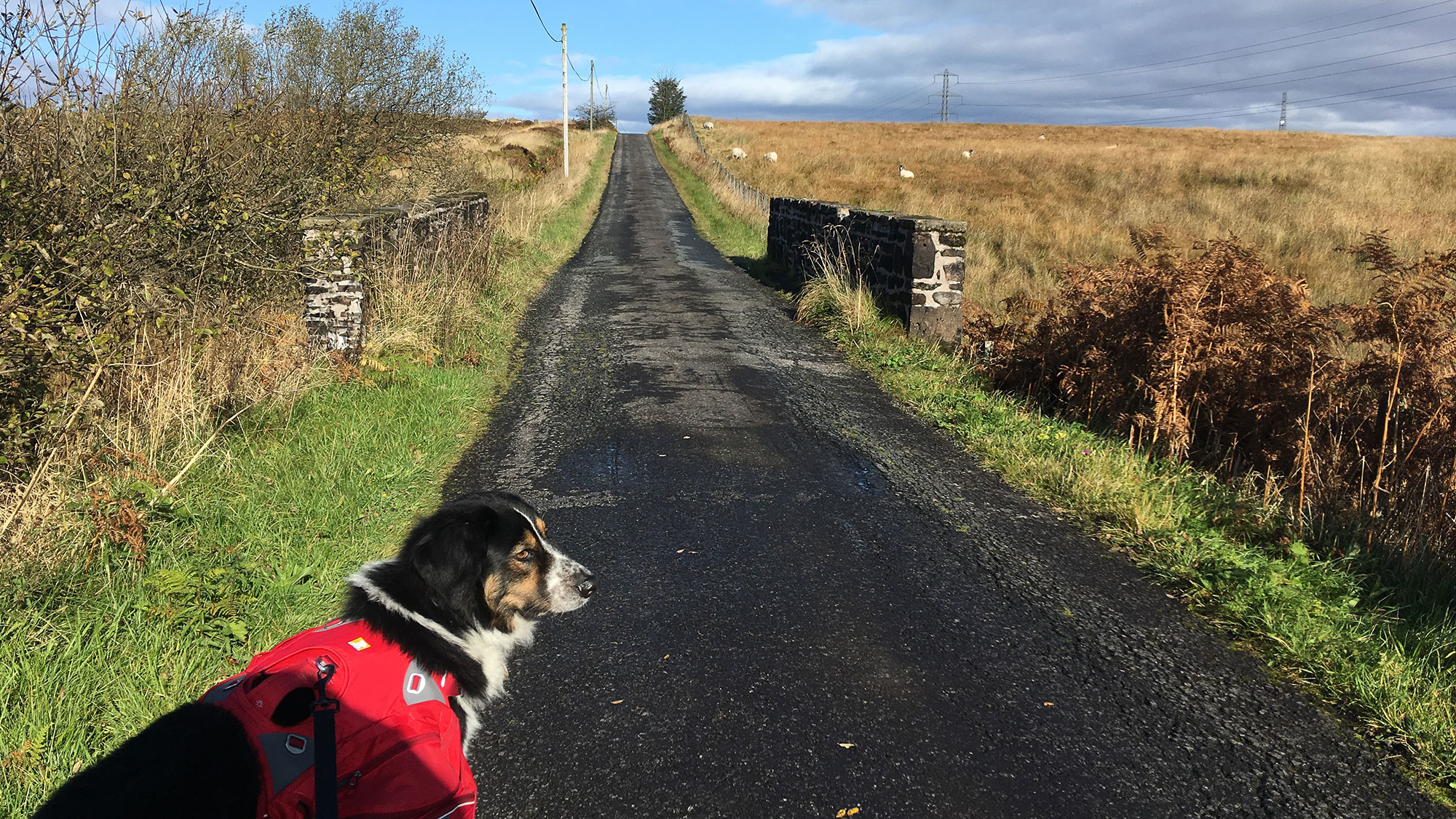 Wo bitte beginnt der Rob Roy Way? Ich sehe hier auf dem Platz nichts außer der Bushaltestelle, es ist aber auch verflixt wenig in dem nebeligen Regen zu erkennen . Also die Karte befragen. Eine Single Road führt schnurgerade und immer leicht ansteigend in Richtung Norden, das sollte es sein. Und mitten auf diesem Weg kommt die Sonne hervor! Raus aus den auf Anhieb zu warmen Regenklamotten und weiter geht es.