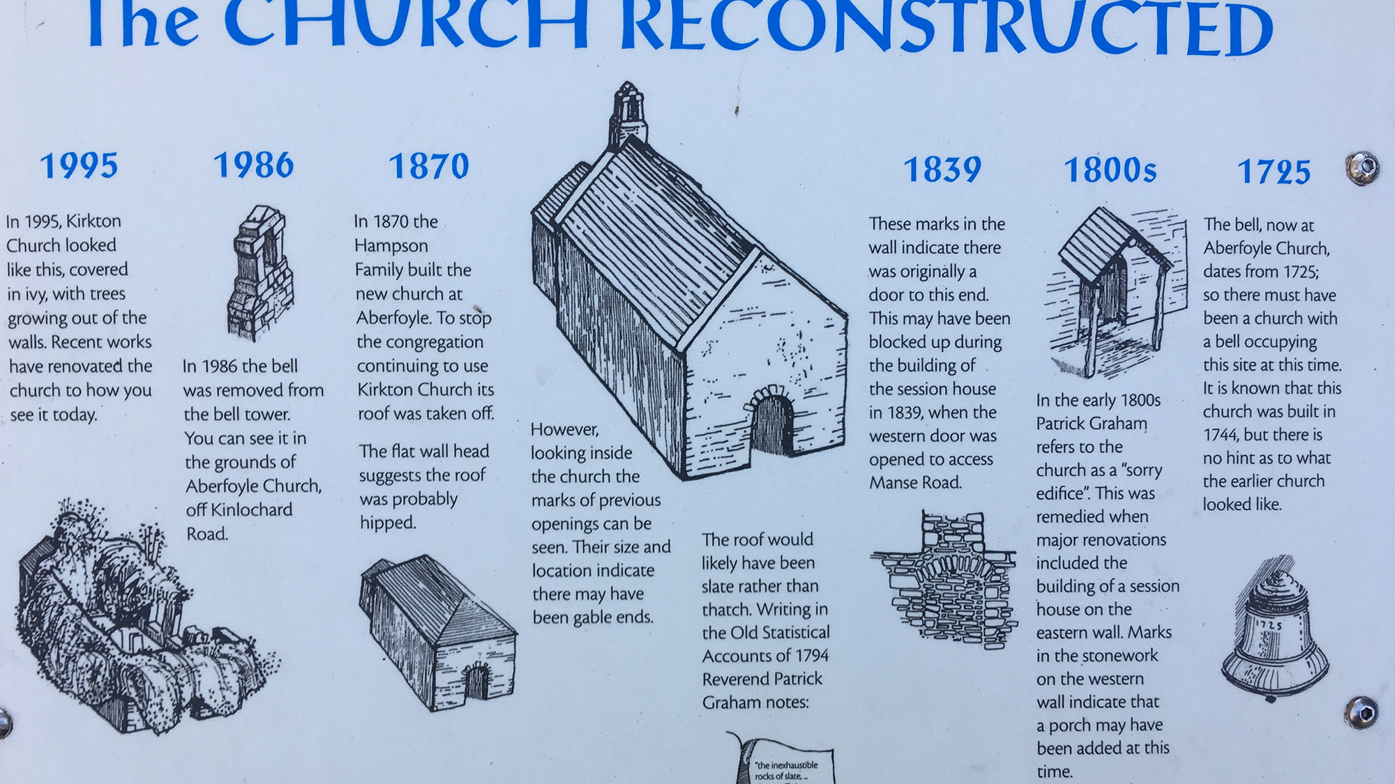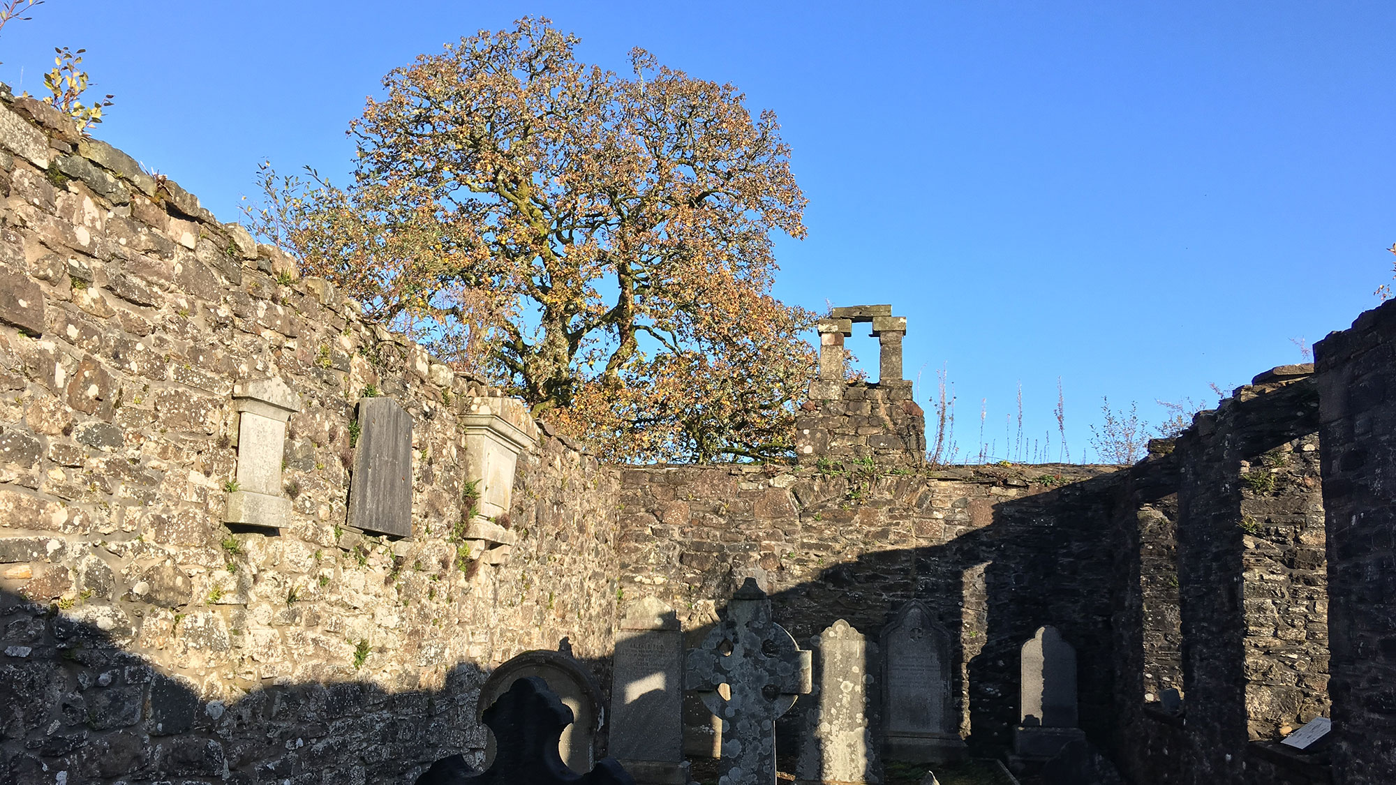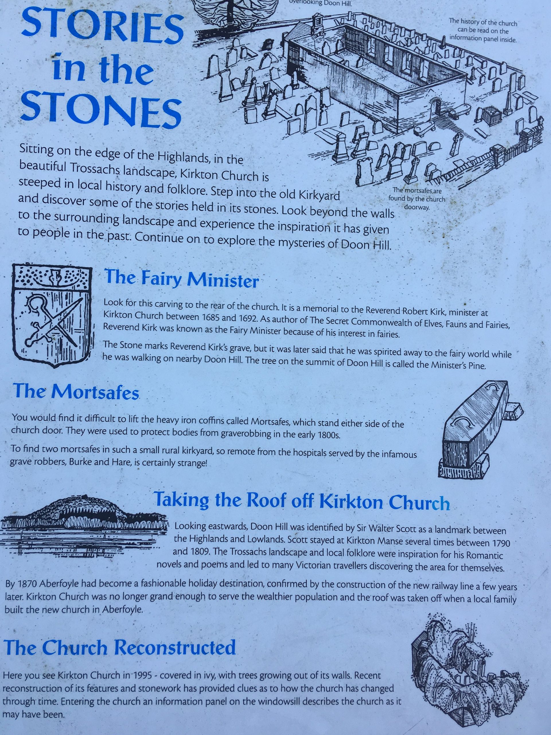 Mozart hat Tempo drauf und so sind wir sehr schnell aus dem Wald heraus und wieder auf Asphalt und am Friedhof von Abertfoyle, wo ich die Kirchenruine besichtige. Zwei komische Blechsärge (Mortsafes, siehe Abbildung „Stories in the Stones) stehen irgendwie gruselig beidseitig des Eingangs. Auf den alten Grabsteinen sind die Inschriften kaum zu entziffern und viele Tafeln stehen windschief oder liegen flach am Boden.