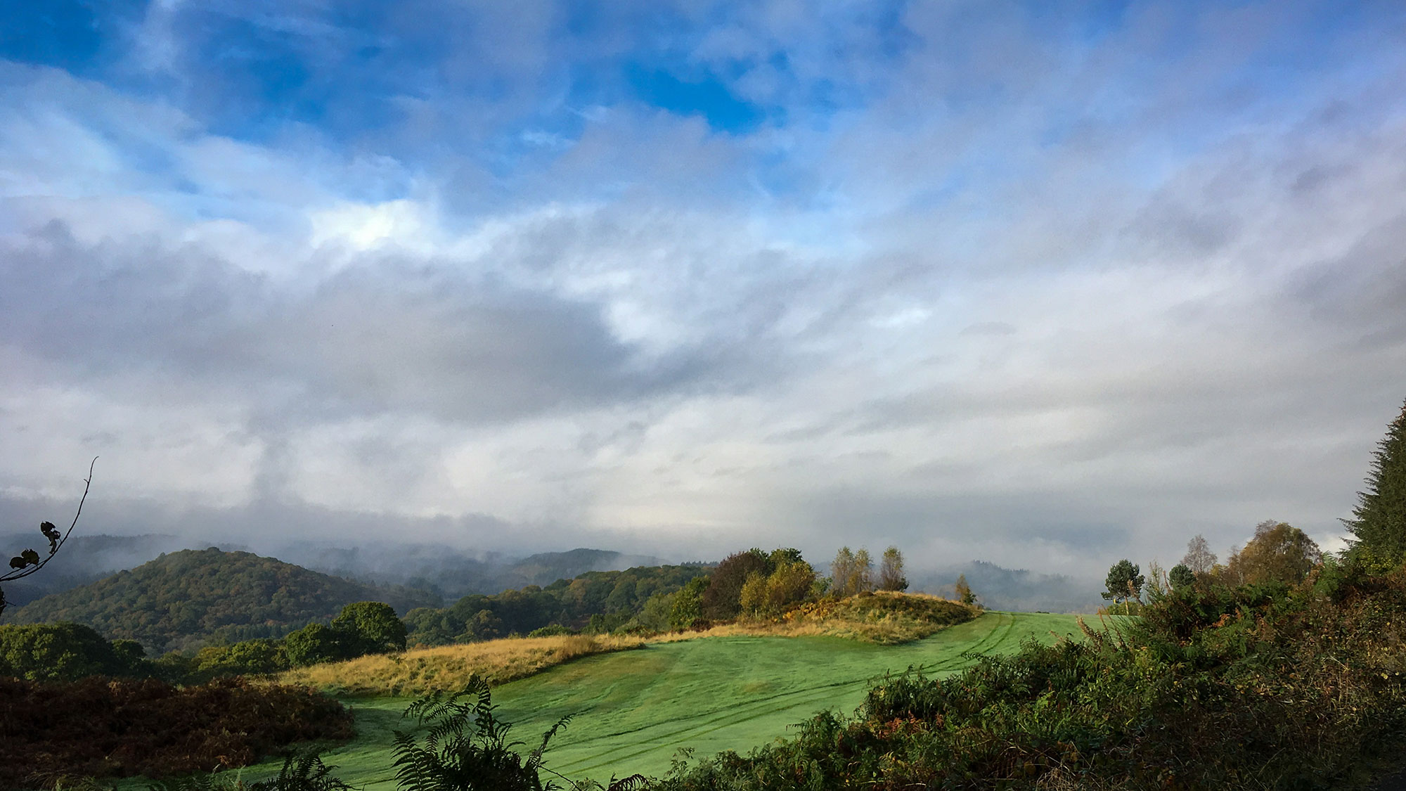 Der Ausblick oberhalb des Golfplatzes auf das im Morgennebel liegende Tal und die Vorfreude auf diesen Wandertag läßt jedoch sofort Glücksgefühle strömen.