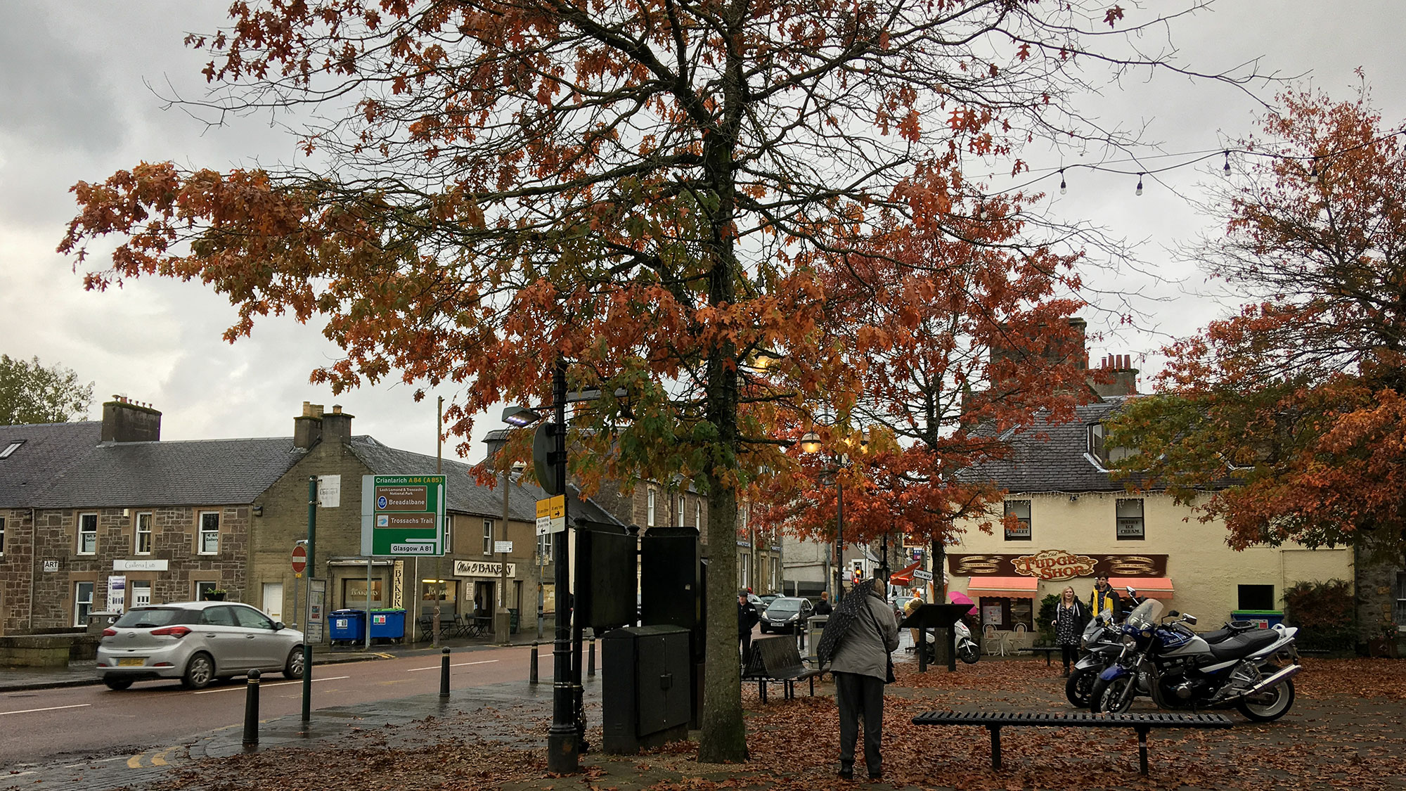 Wir müssen vor Callander noch einmal über eine Forststraße etwas hinauf und wieder hinunter, je näher wir Callander kommen, desto schmaler wird der Weg. Wir erreichen eine Hauptstraße und durchqueren einen typischen Playground, überqueren eine Brücke und schon sind wir mitten in Callander. Die Stadt besteht hauptsächlich aus einer busy Hauptstraße. Ein Platz links und rechts der Straße gibt dem ganzen etwas Raum.