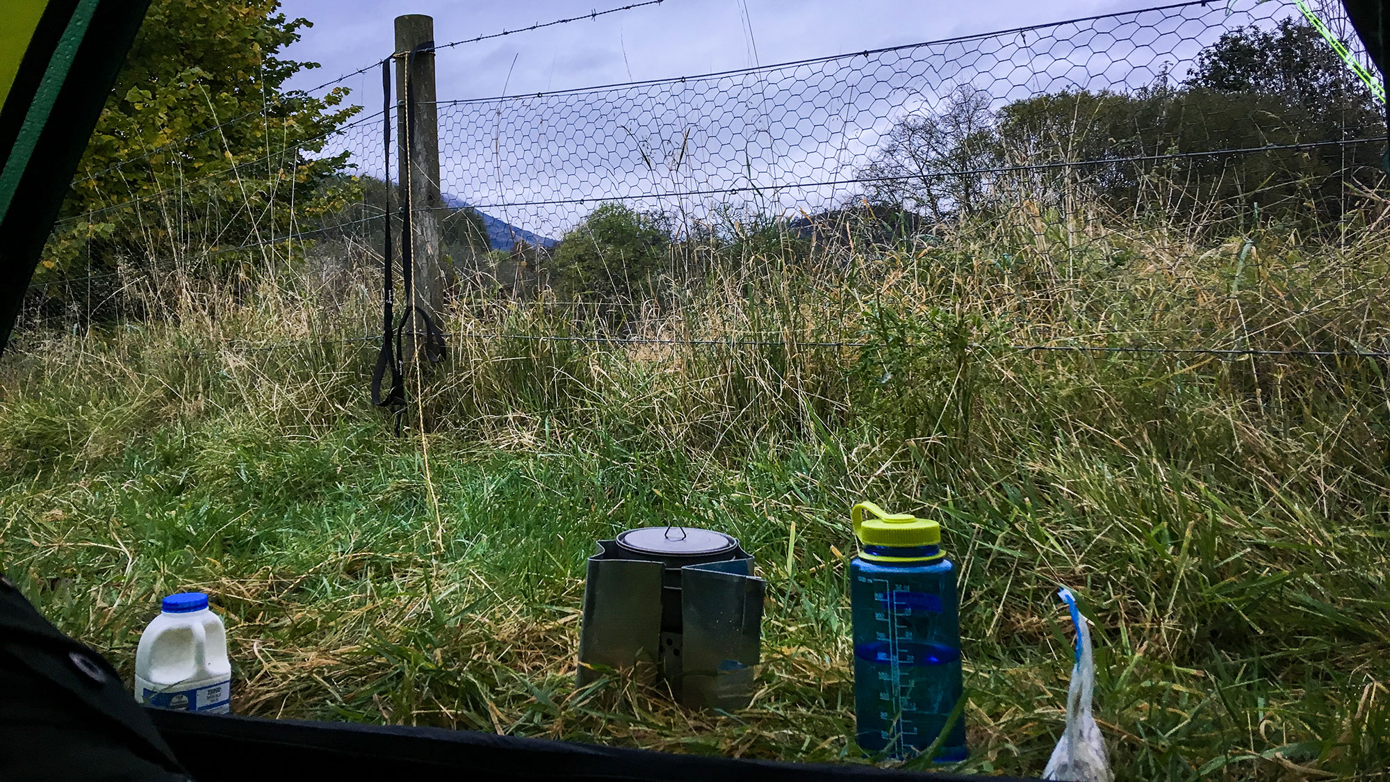 Gerade als das Außenzelt steht beginnt ein kurzer, aber heftiger Schauer. Ich schmeiß den Rucksack unter das Zeltdach und Mozart springt hinterher. Wir sind im Trockenen, nur das Gras ist etwas feucht.