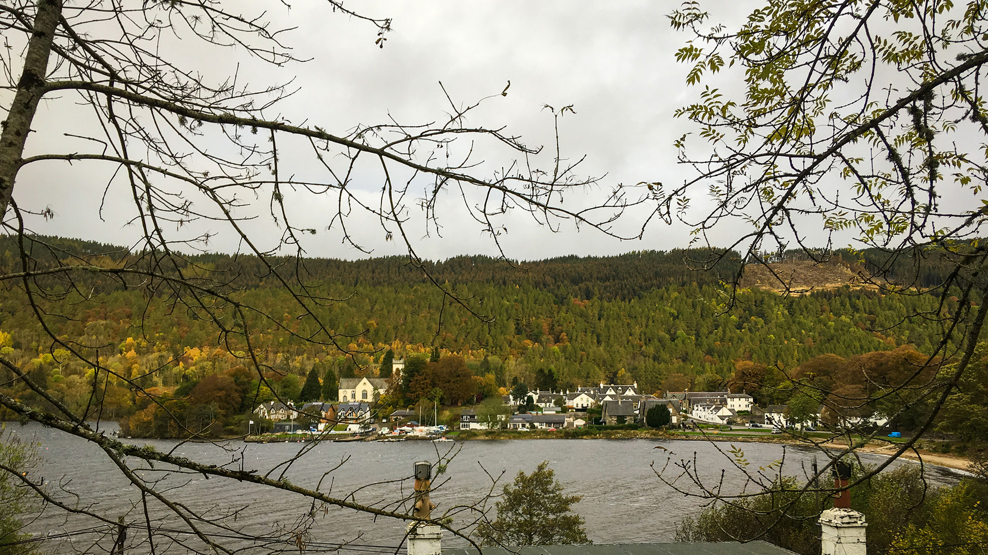 In der Nacht war es wieder sehr kalt gewesen, der Tag ist grau, aber ohne Regen. Ich verlasse das gemütliche Cottage und meine Gastgeber steigen in ein Auto, um in Perth shoppen zu gehen. Ich winke dem Fahrzeug hinterher und wir folgen wieder der Straße in Richtung Kenmore. Nein, ich gehe nicht noch einmal hinauf zu den Falls of Acharn und über die Kuhweide, verpeile es aber dummerweise den alternativen Aufstieg zum Queen’s Drive vor Kenmore zu finden. Dann nehmen wir halt den Zustieg in Kenmore, vorbei an Wohnhäusern, über Serpentinen, bis wir wieder auf den Rob Roy Way stoßen.