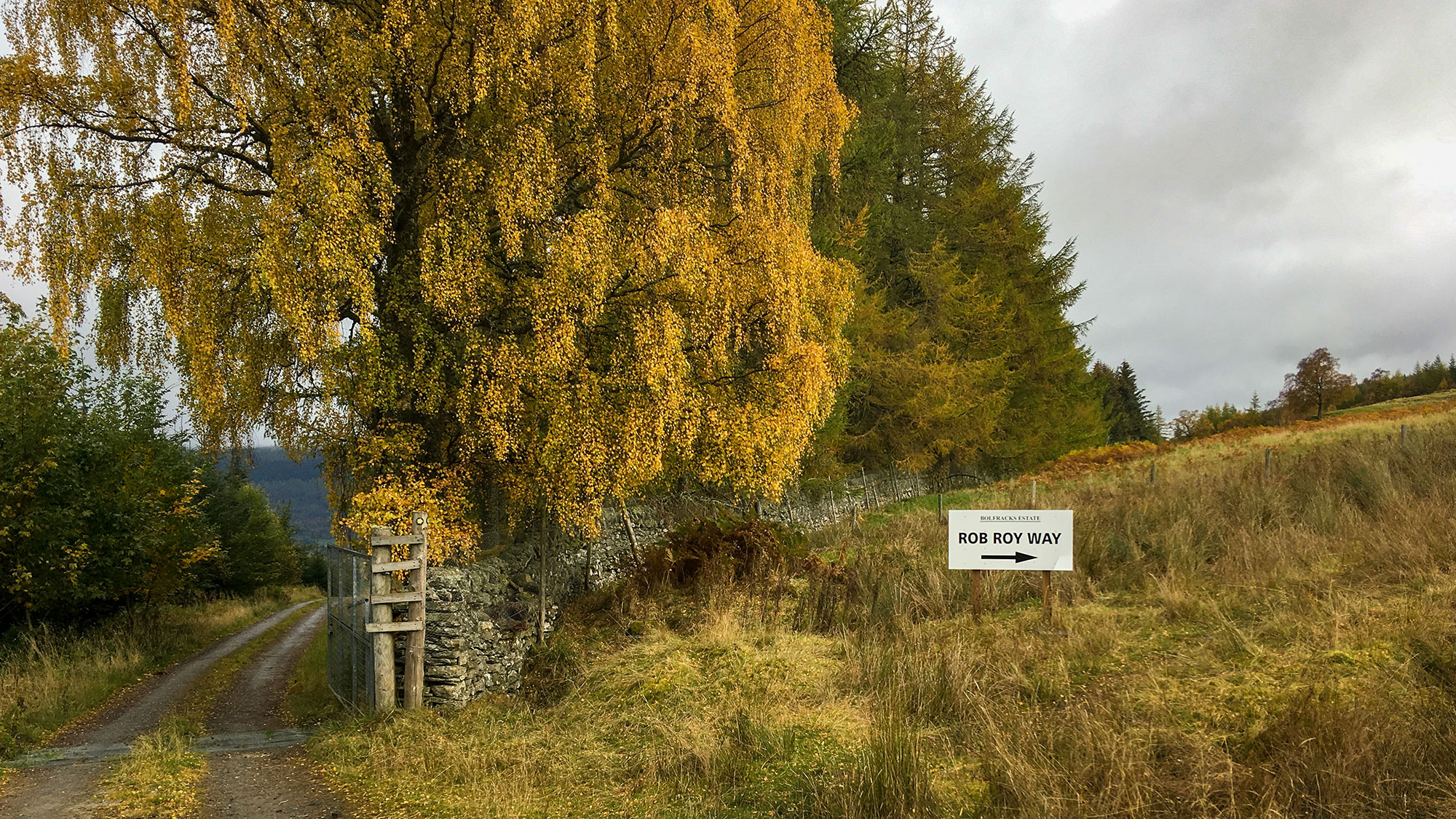 Wir erreichen ein Cottage, biegen links davor ab, gehen ein Stück geradeaus, um dann wieder rechts abzubiegen um auf ein riesiges Hinweisschild des Rob Roy Way zu stoßen, das den Weg über die Wiese weist. Hier scheint wohl so mancher Wanderer geradeaus in die Einfahrt zu dem Privatgrundstück gelaufen zu sein.