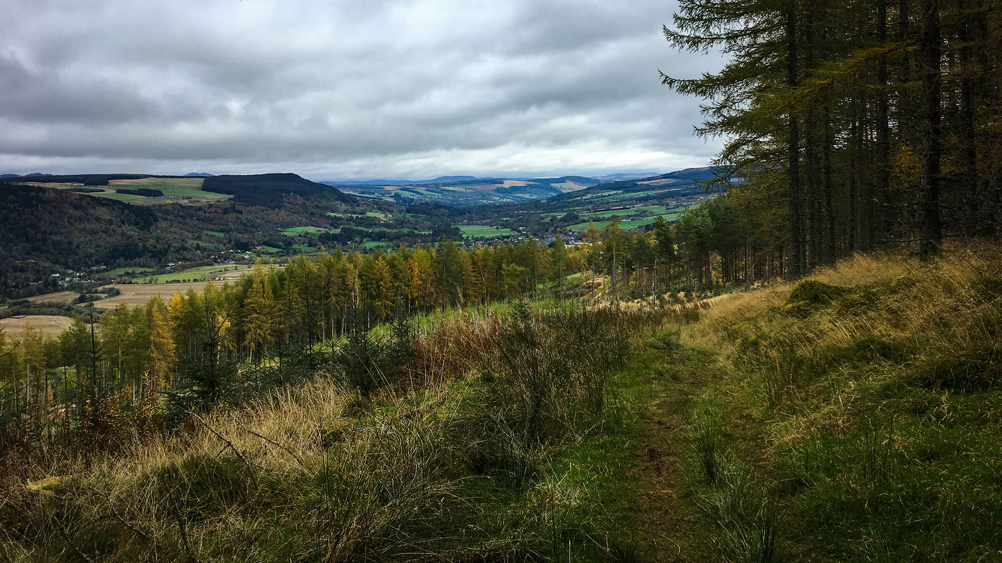Der gesamte Weg bis Aberfeldy führt oberhalb des River Tay und unterhalb der Hills entlang. Mal über Weiden mit Schafen, mal durch den Wald, dessen Forstwege teilweise von einem Harvester oder anderen schweren Fahrzeugen völlig zerfleddert wurde. Die frei gelegte braune Erde erscheint mir wie große Wunden, es ist sehr bedrückend und erinnert mich stark an die abgeholzten, kaputten Tannenwälder im Sauerland. Einziger Unterschied, hier sind die Tannen weder vertrocknet, noch vom Borkenkäfer ermordet worden.