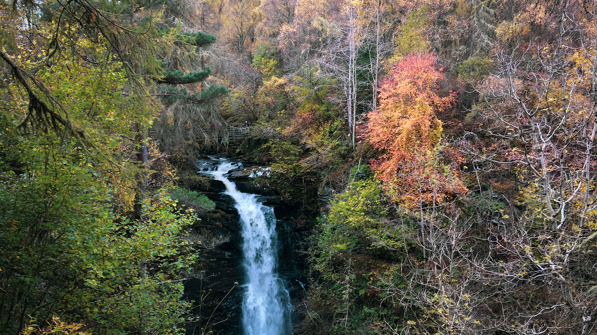 Kurz vor Aberfeldy wandern wir durch einen herbstlichen, gelben Birkenwald noch einmal ein Stück bergauf zu den Wasserfällen, den Falls of Moness. Wir sind in den Birks of Aberfeldy, so steht es auf jeden Fall auf einem Schild, und begegnen unaufhörlich Menschen, die hier spazieren gehen.