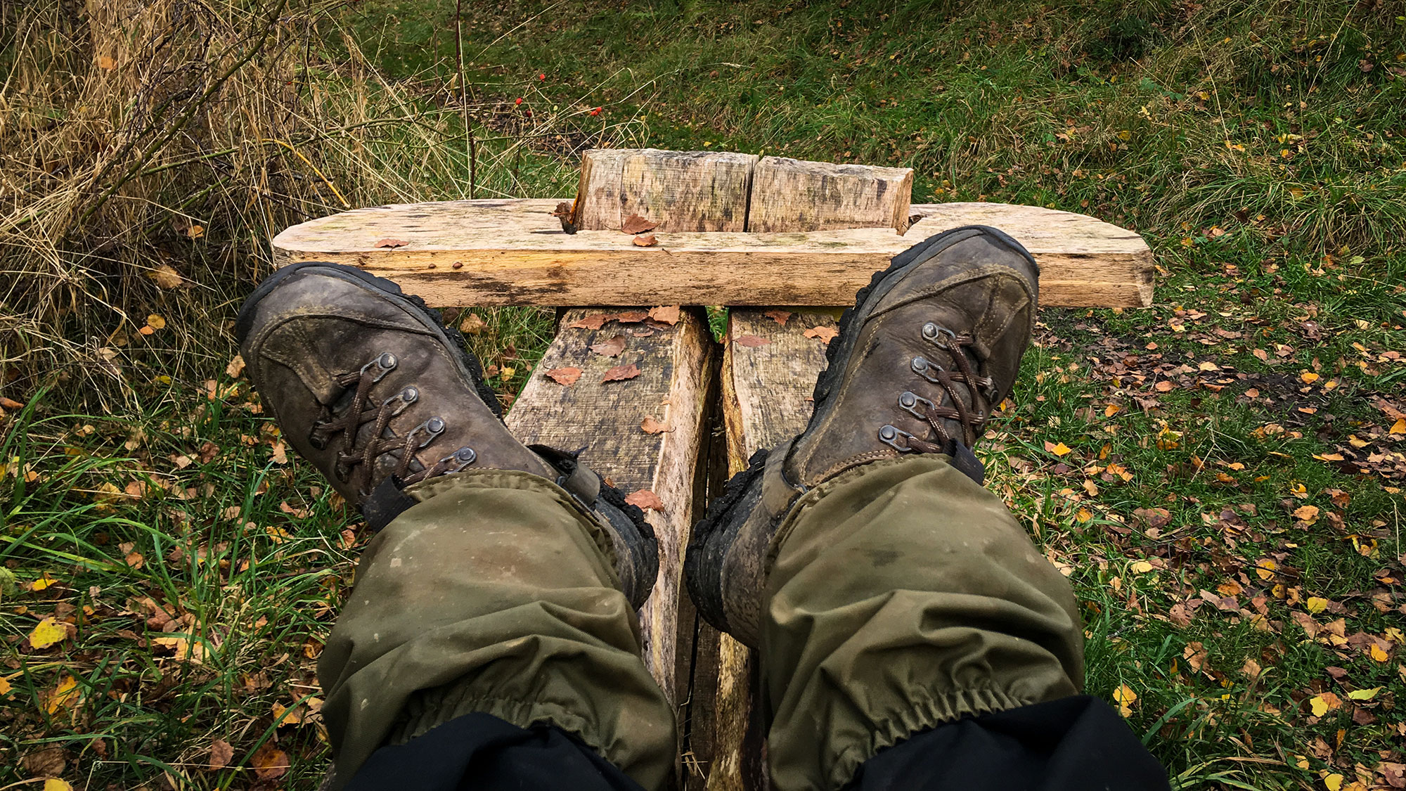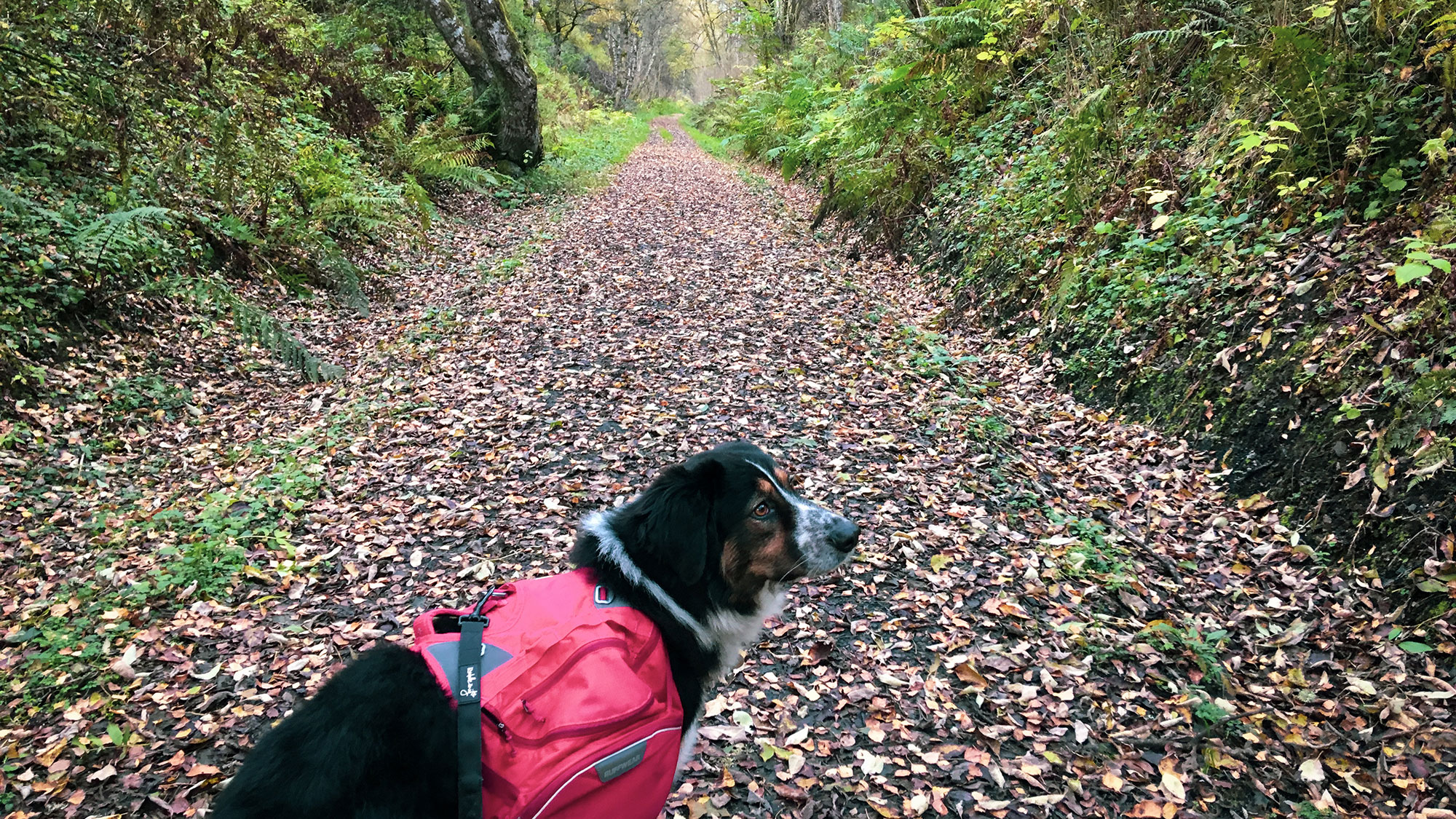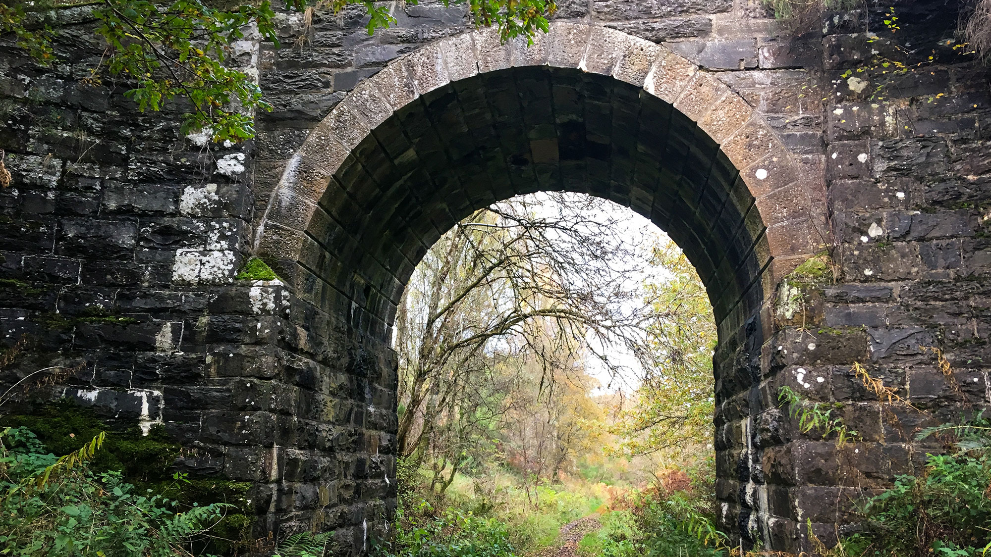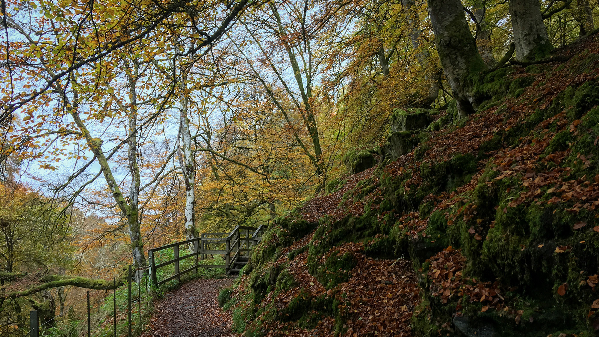 Nach 30 wundervollen, weichen Minuten geht es leicht aufwärts auf die alte Railway Linie und die A827 kommt hörbar nah an den Weg heran, der komplett mit Blättern bedeckt ist, wie mit einem Naturteppich. Die Sicht auf den Fluß war einmal und man geht wie durch einen oben geöffneten Tunnel. Wir treffen auf steinerne Brücken über uns und irgendwann vor unserem eigentlichen Ziel beginnen meine Füße zu brennen und heißzulaufen. An einem Rastplatz lege ich sie ein paar Minuten hoch, dann geht es wieder.