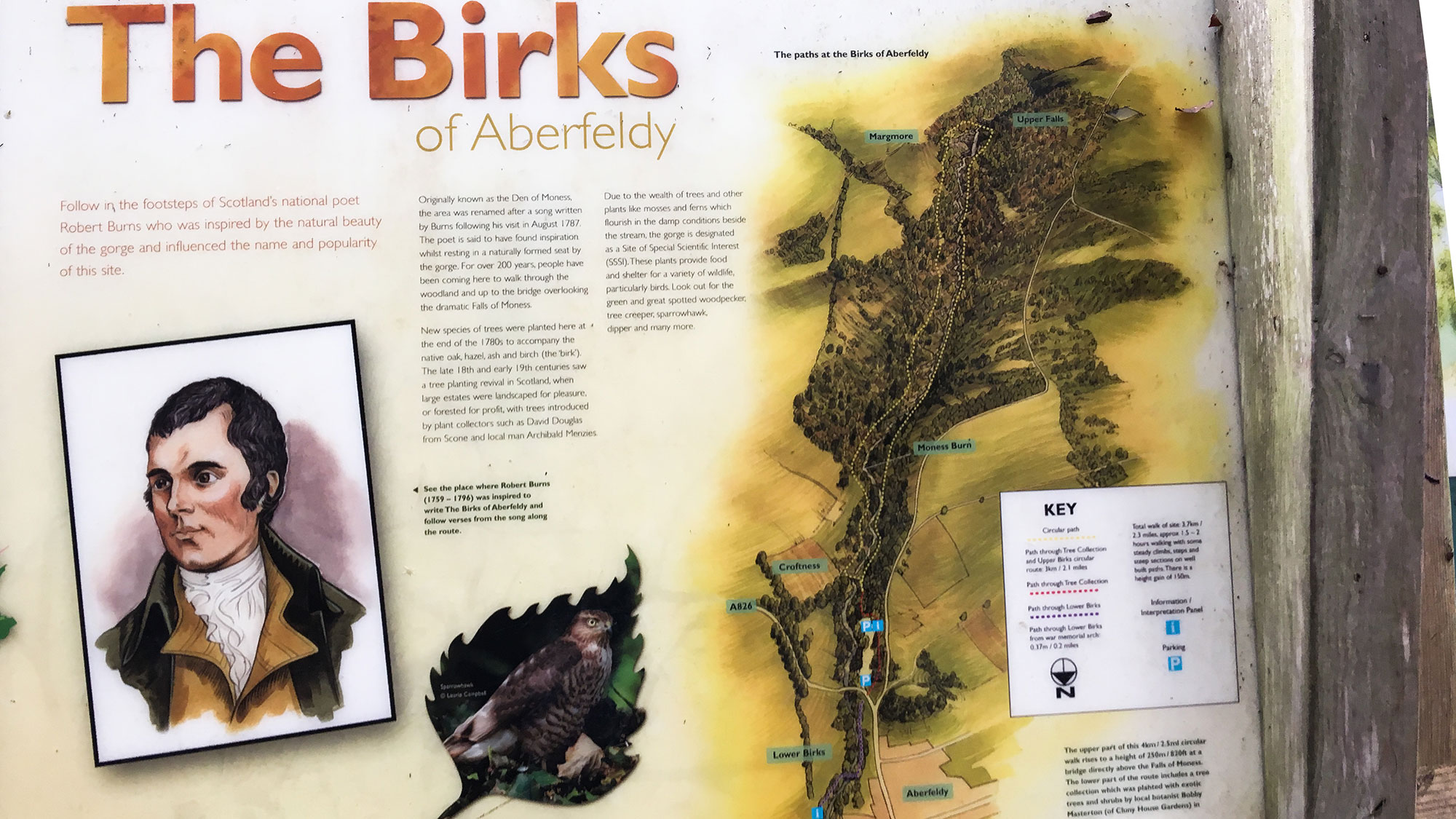 Unten angelangt treffen wir auf eine Statue von Robert Burns und später auch auf eine Hinweistafel mit Infos zu Burns und seinen, von dem Ort inspirierten Schriften. Er war bestimmt im Herbst hier!