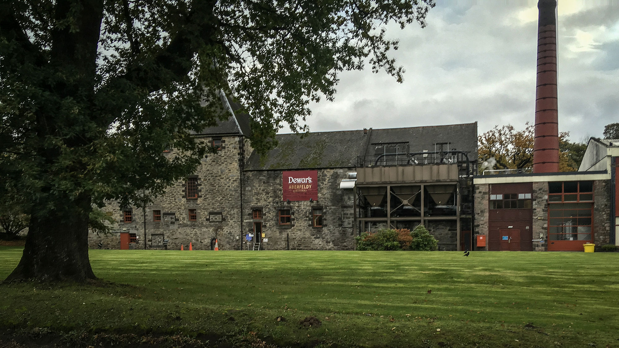 Wir verlassen Aberfeldy, aber nicht ohne vorher beim Bäcker noch etwas Süßes für das morgige Frühstück gekauft zu haben. Am Ortsausgang kommt man zwangsläufig an der Aberfeldy Distillery vorbei, auf deren Wiese eine große Anzahl an Perlhühnern sitzt. Nachdem wir den Friedhof passiert haben schwenken wir endlich von der langen, geraden und lauten Hauptstraße ab und es geht auf grasigem Untergrund über einen Fußweg in Richtung River Tay.