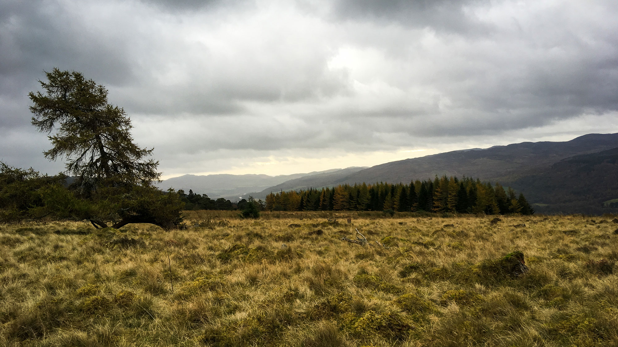 Wir überqueren eine kleine Brücke über den Tullypowrie und erreichen das auf der Karte eingezeichnete Gate. Die etwas graue, düstere Stimmung passt zu der Landschaft, die wir jetzt durchqueren. Was nicht heißt, dass es bei Sonnenschein nicht schön wäre, aber es kommt mir eben immer so vor, als wäre der Augenblick so für mich geschaffen worden, mit eben diesem Licht. Wenn ich jetzt noch wüßte wie all die Büsche und Pflanzen heißen!