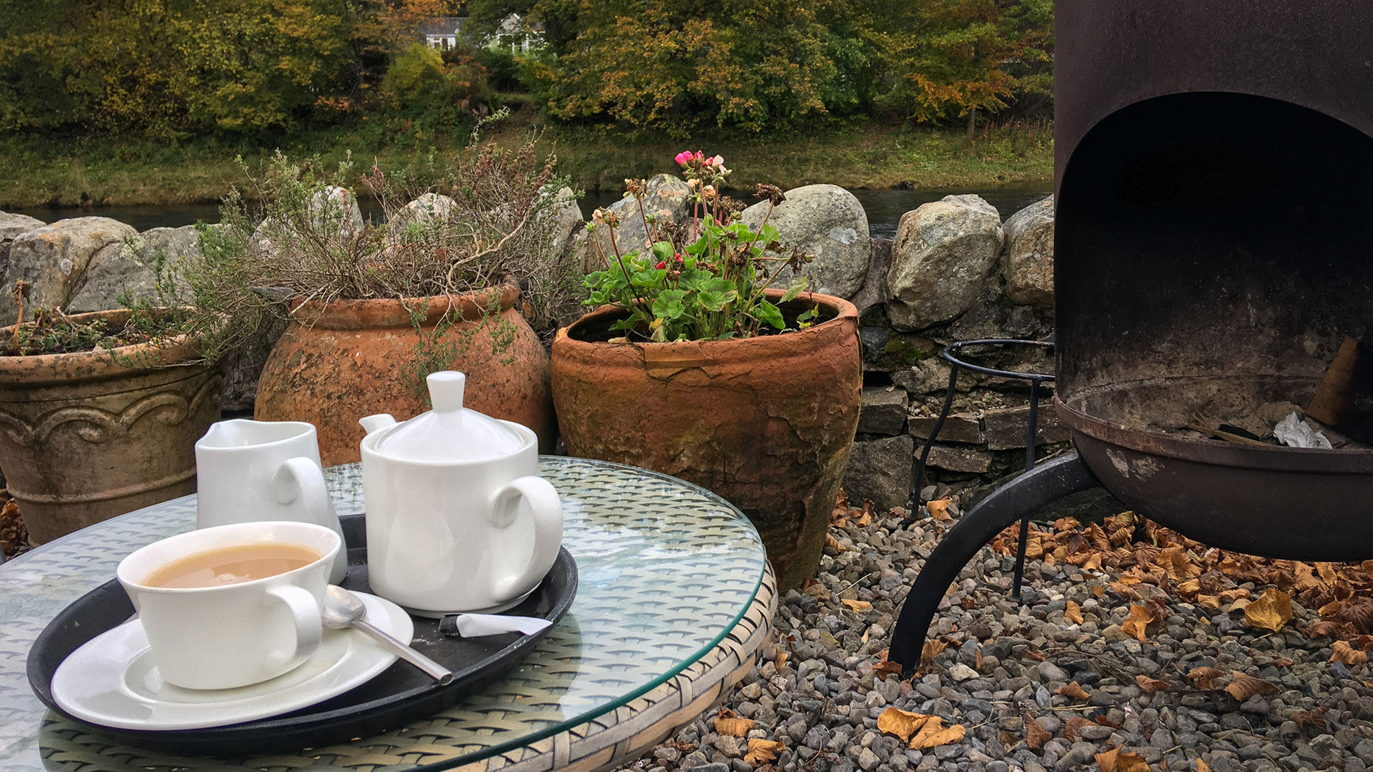 Am Morgen ist es grau, aber nicht mehr so kalt wie an den letzten 3 Tagen, bzw. Nächten. Als Erstes gibt es wieder warme Milch mit Espresso Kaffeepulver, mein spezieller Latte Macchiato. Dazu gibt es Scones und Leckereien vom Bäcker aus Aberfeldy. Und das alles gemütlich an der Picknickbank neben dem Zelt. Dann wird abgebaut. Heute ist das Zelt ausnahmsweise nicht angefroren oder nass vom nächtlichen Regen oder feucht vom Morgentau. Es wird trocken nach Pitlochry getragen.
