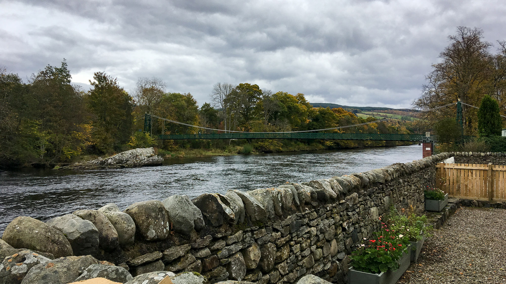 Endlich kommt die Zeit um zum Port-na-Craig Inn zurück zu gehen. Dieser Rummel in der Stadt ist nichts für mich und erst recht nicht für Mozart. Wir gehen erneut über die schmale Fußgängerbrücke über den River Tummel und werden herzlich begrüßt.