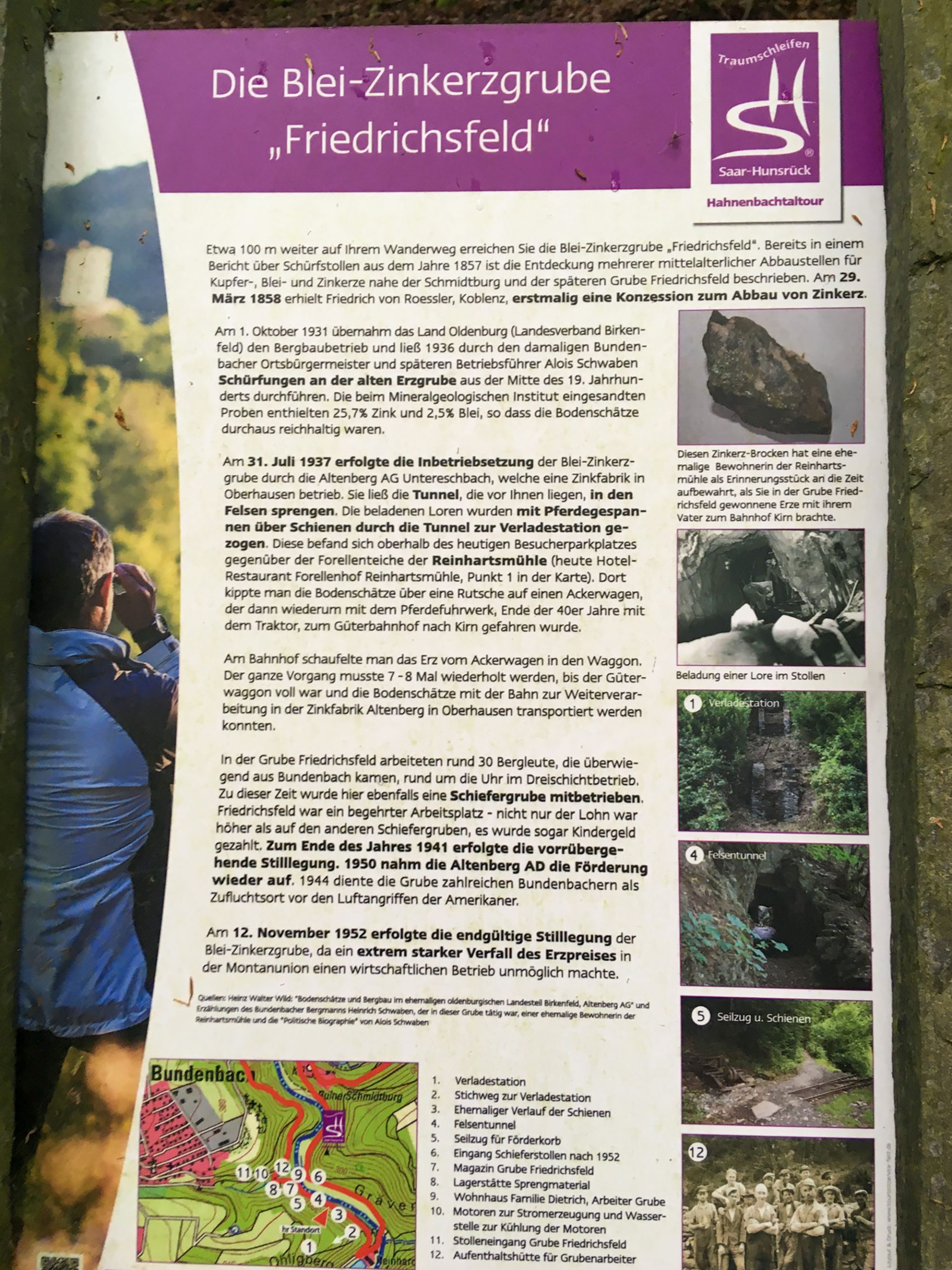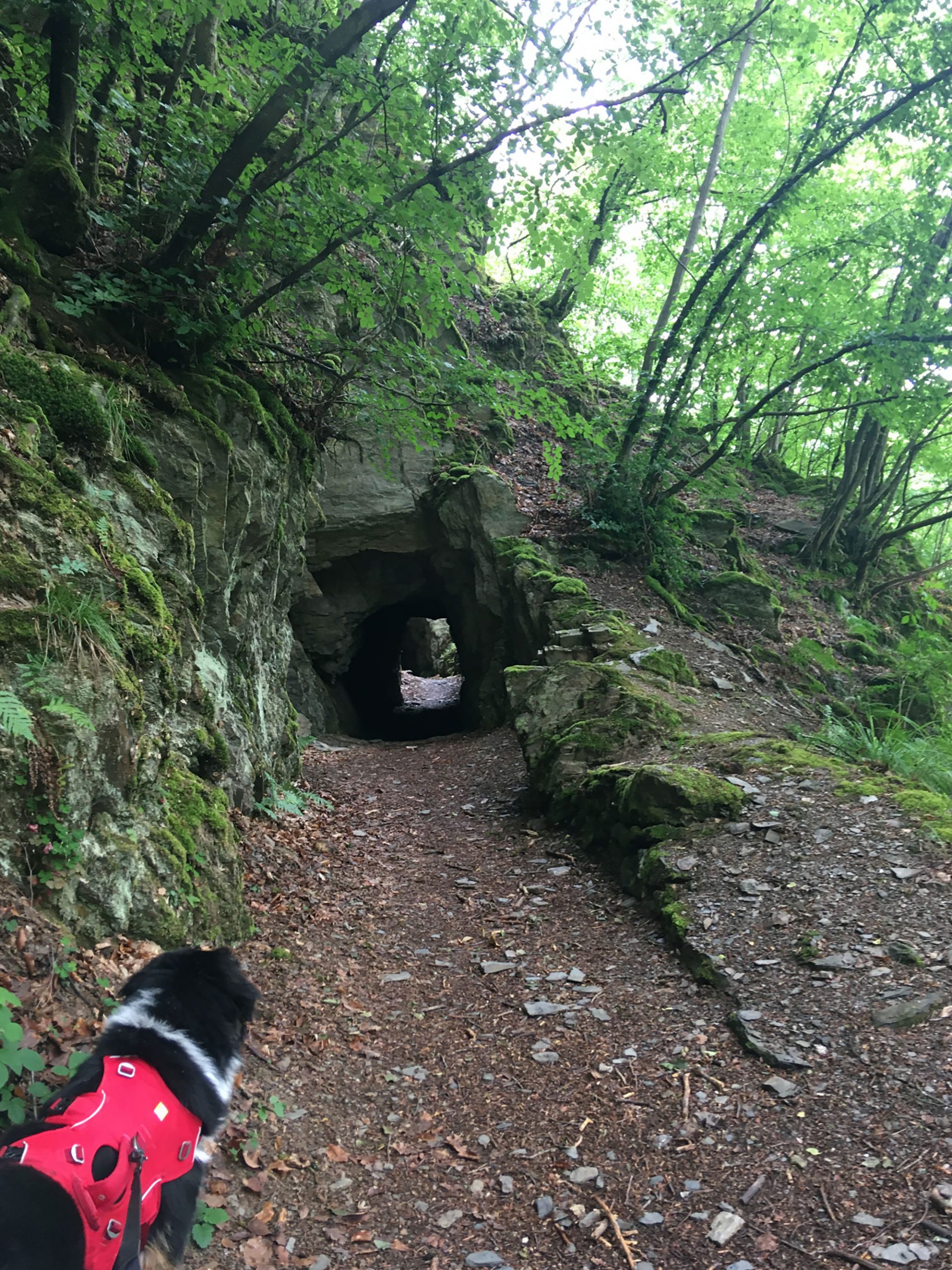 Am Forellenhof steigen wir wieder hinauf in den Wald zum ersten Highlight für Kinder, einem Tunnel durch den Schiefer, der hier abgebaut wurde. Prompt stößt man auf Schienen, auf denen wohl der Abbau transportiert wurde. Auch Zink wurde hier abgebaut, wie ich einer Schautafel entnehme