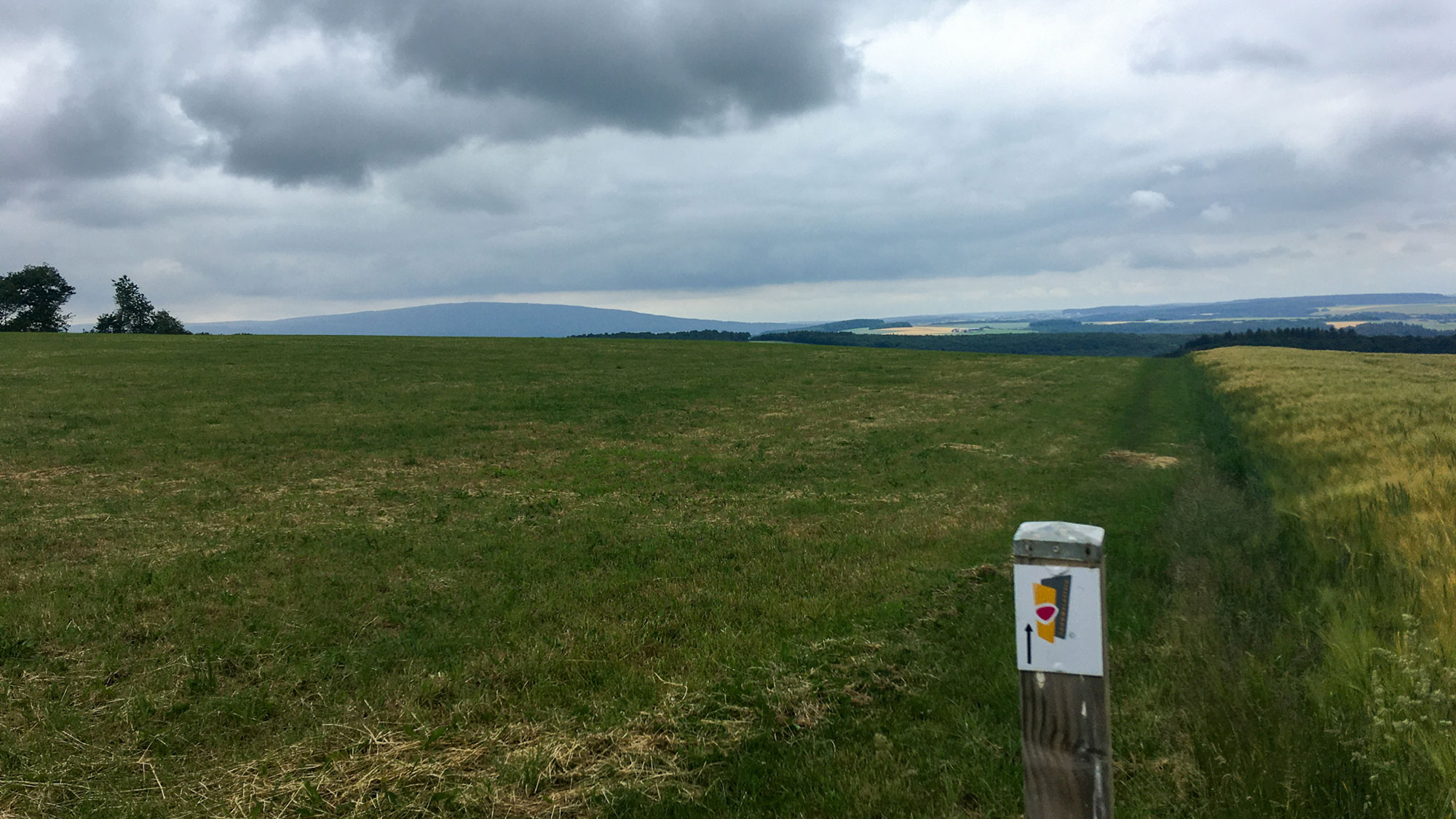 Wieder im Wald geht es stetig bergan in Richtung Schneppenbach und Lützelsoon, das Örtchen sehen wir aber nur aus der Ferne, nachdem wir oben auf ca. 400 Meter angelangt sind und über die Felder gehen. Trotz der grauen Wolken und dem diffusen Licht hat man von hier eine grandiose Sicht weit über die Landschaft und die vielen Erhebungen in der Ferne.