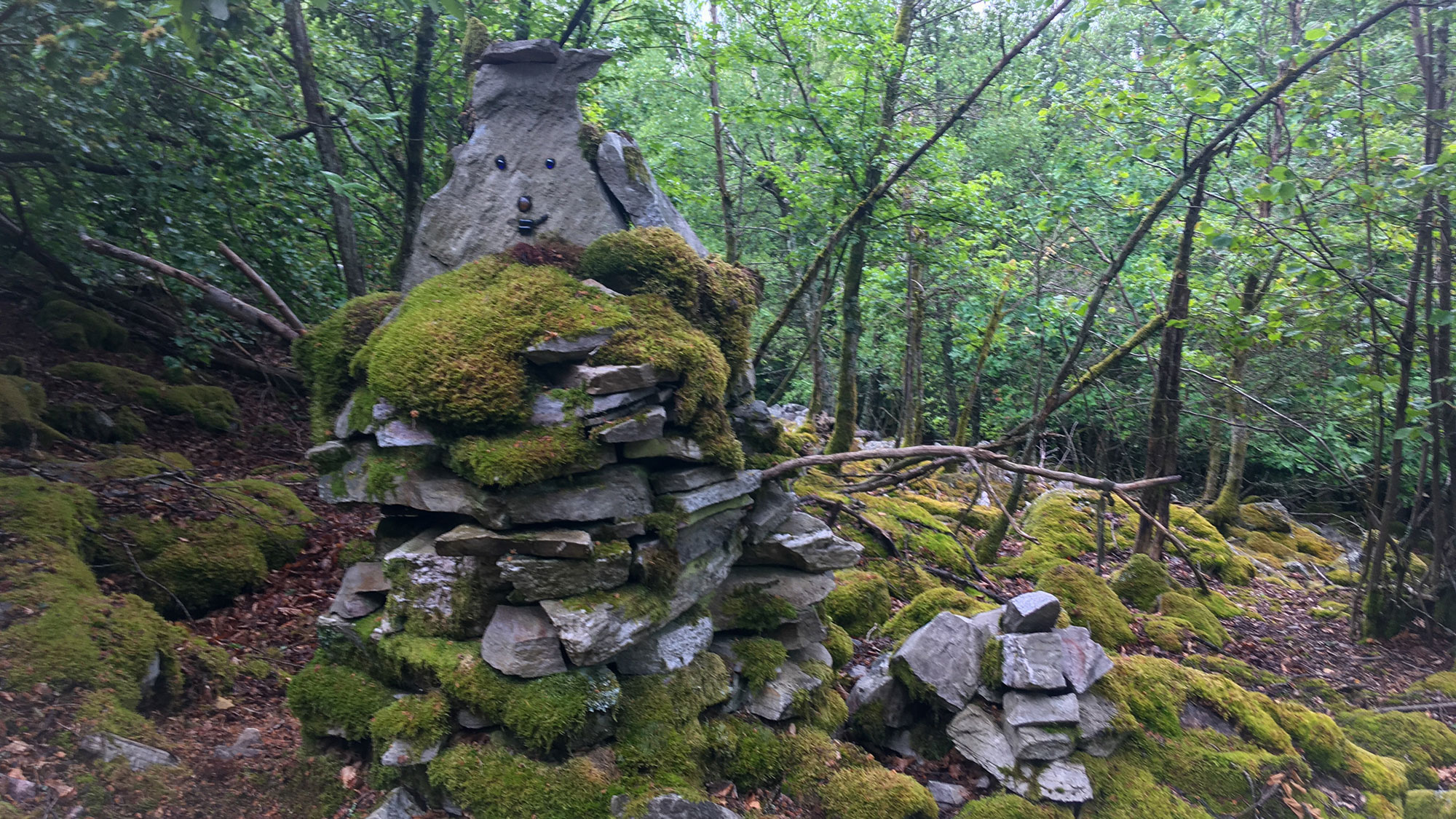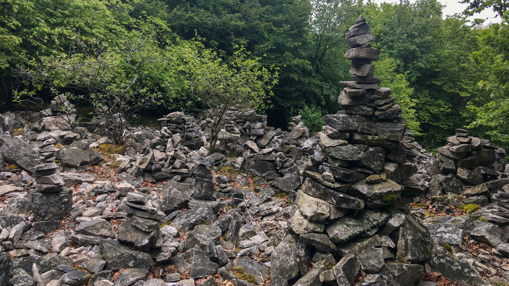 Was nun folgt ist ein Pfad über Steine und Moos auf dem Kamm des Lützelsoon entlang. Mozart und ich finden das super und tänzeln über und neben den Steinen hindurch. Dann stehen plötzlich massenhaft und ziemlich große Steinmännchen und Steintürme auf und an dem Pfad. Einige davon größer als ich! Das ist der Herdentrieb! Einer fängt an, und viele Andere machen es nach!