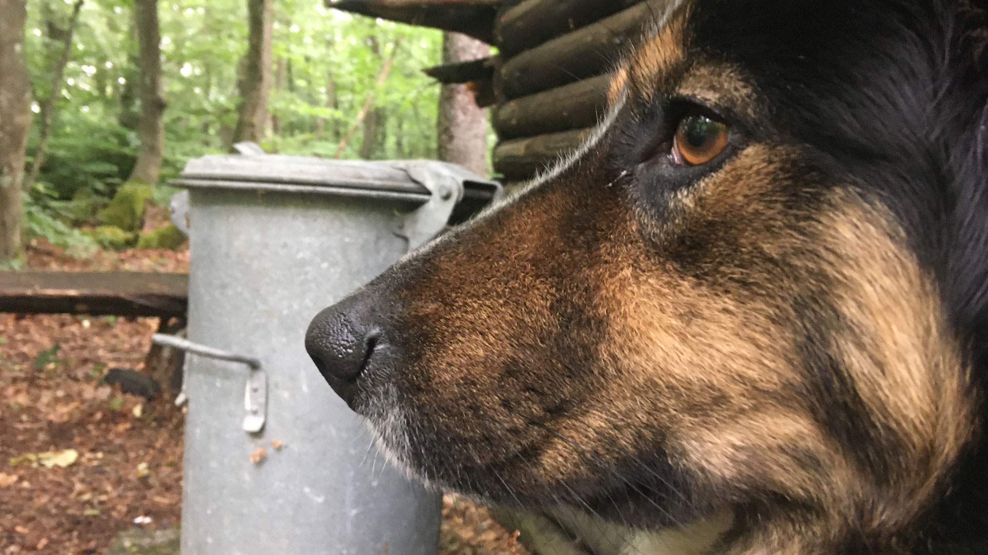 Nach dem Überqueren einer Landstraße sind wir wieder im Wald, erreichen bald eine Schutzhütte und warten dort, bis der Regen etwas Nachgelassenen hat. Das Timing ist optimal, denn der Magen knurrt und so esse ich ein leckeres Dinkel-Käse-Knäckebrot und ein Stück Ziegenkäse. Mozart bekommt eine Portion Leckerli und so lauschen wir den Vögeln im Wald und den Regentropfen auf den Blättern zu.