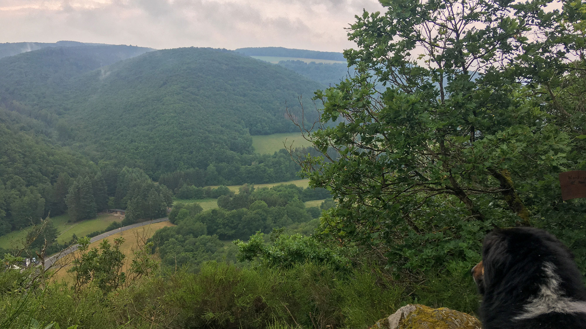 Früh am Morgen mache ich mit Mozart erst einmal einen kleinen Spaziergang zum Hahnenbach, bevor es zum Frühstück eine Portion Porridge und einen Kaffee gibt. Vor 9 Uhr stehen wir aber schon wieder auf der Straße und gehen das kurze Stück zurück auf den Steig, in den Lützelsoon. In der Nacht hat es derbe geregnet, und die Luftfeuchtigkeit ist entsprechend hoch, dazu hängen die Wolken tief am Himmel.