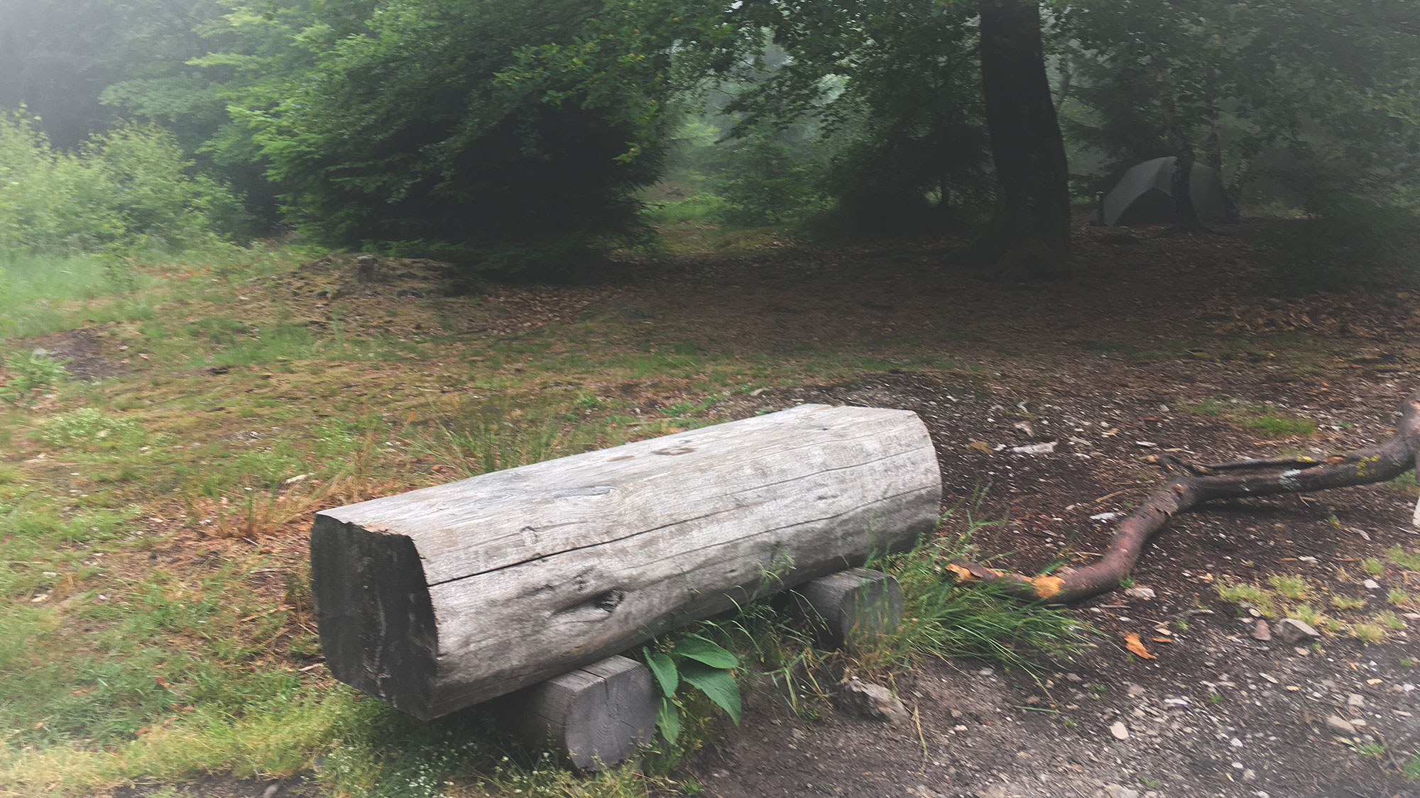 Schnell ein Besuch auf dem Bio-Plumpsklo, dann das Zelt abbauen, währenddessen Wasser für einen Kaffee kochen und ein Knäckebrot am Lagerfeuer kauen. Die verbliebenen Zelte stehen still im Morgennebel. Mozart war super, hat keinen Laut von sich gegeben, so haben wir niemanden aufgeweckt, hoffentlich!