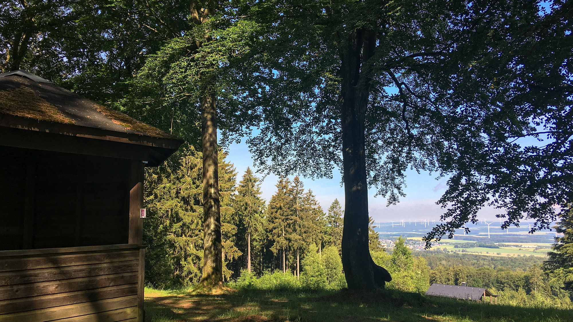 Eine schattige Liegebank neben einer Schutzhütte mit Blick auf die Landschaft gen Norden schreit ganz laut, so machen wir eine kurze Rast für ein paar Fotos. Ausnahmsweise gehe ich mit dem Handy auf Empfang, um diesen Moment mit meiner Familie zu Hause zu teilen. Hunger stellt sich immer noch nicht ein, das Käseknäckebrot ist echt sättigend und „knäckt“ nicht, sondern bleibt im Rucksack gestopft sogar ganz.
