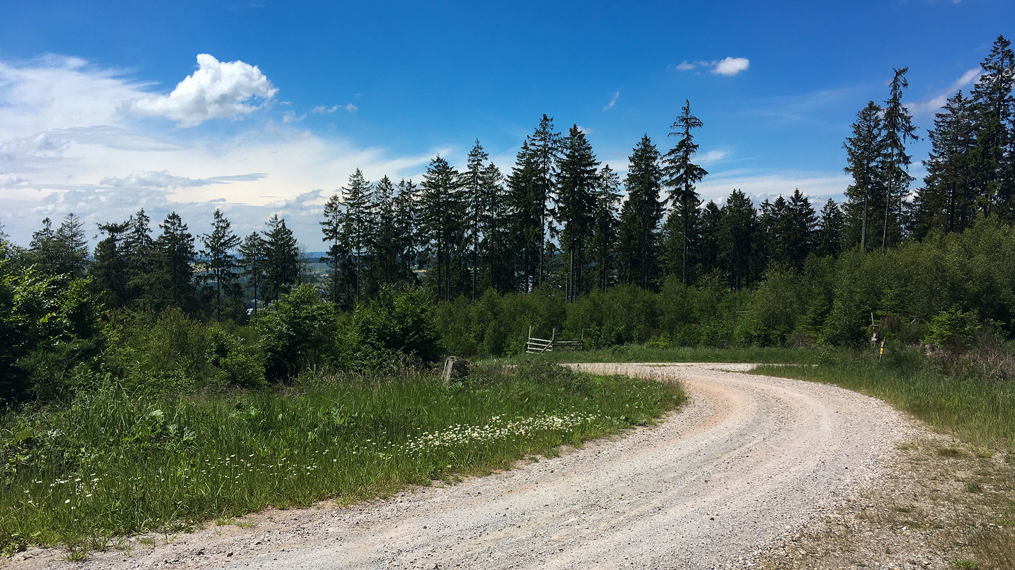 Bis zum Forsthaus Emmerichshütte schwitzen wir gemeinsam den Aufstieg hinauf. Dort machen sie ihre Pause an einem sonnigen Rastplatz und ich gehe weiter. Zunächst noch stetig bergan durch den Wald, aber dann werden die Wege breiter und sonniger. Immer wieder versorge ich Mozart mit Wasser. Komisch, vor lauter Sorge um Mozart fällt mir der Weg überhaupt nicht schwer.
