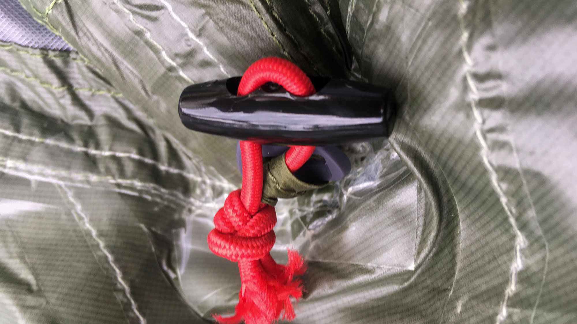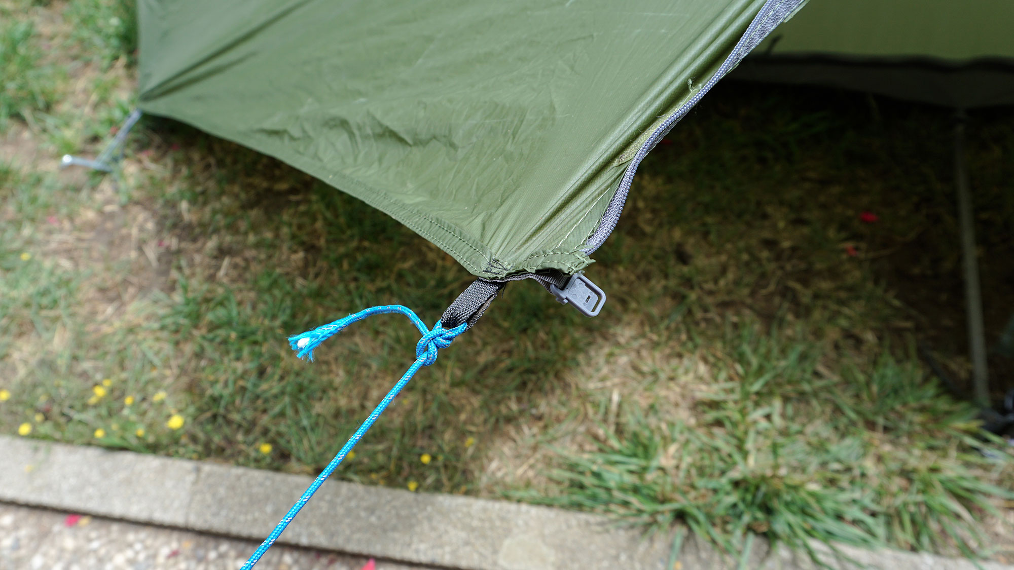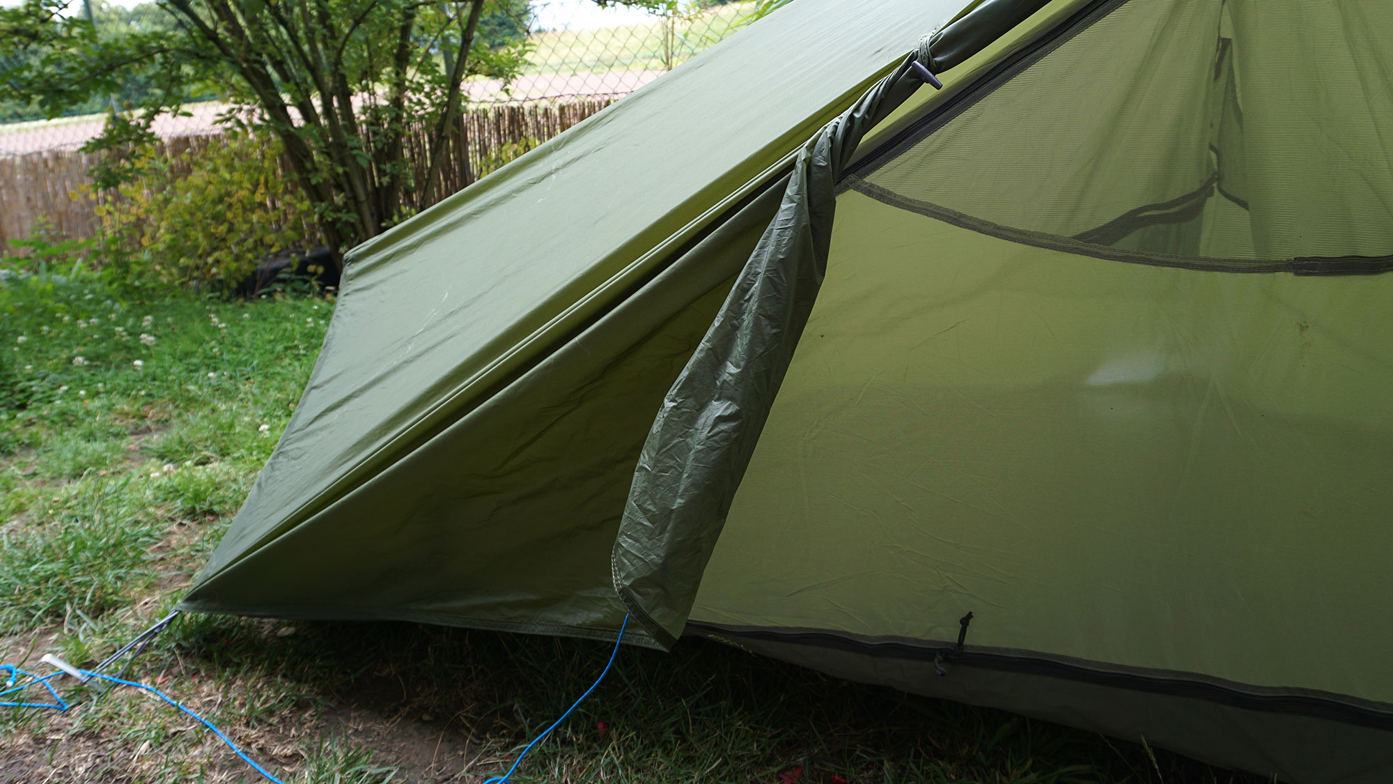 Eine zusätzliche Schlaufe weiter unten am Außenzelt anzunähen traue ich mich nicht, da ich die Nähte nicht wasserdicht verschweißen kann. Außerdem hätte ich gerne ein kleines Minivorzelt bei Regen, damit etwas mehr Platz zum Kochen zur Verfügung steht.
