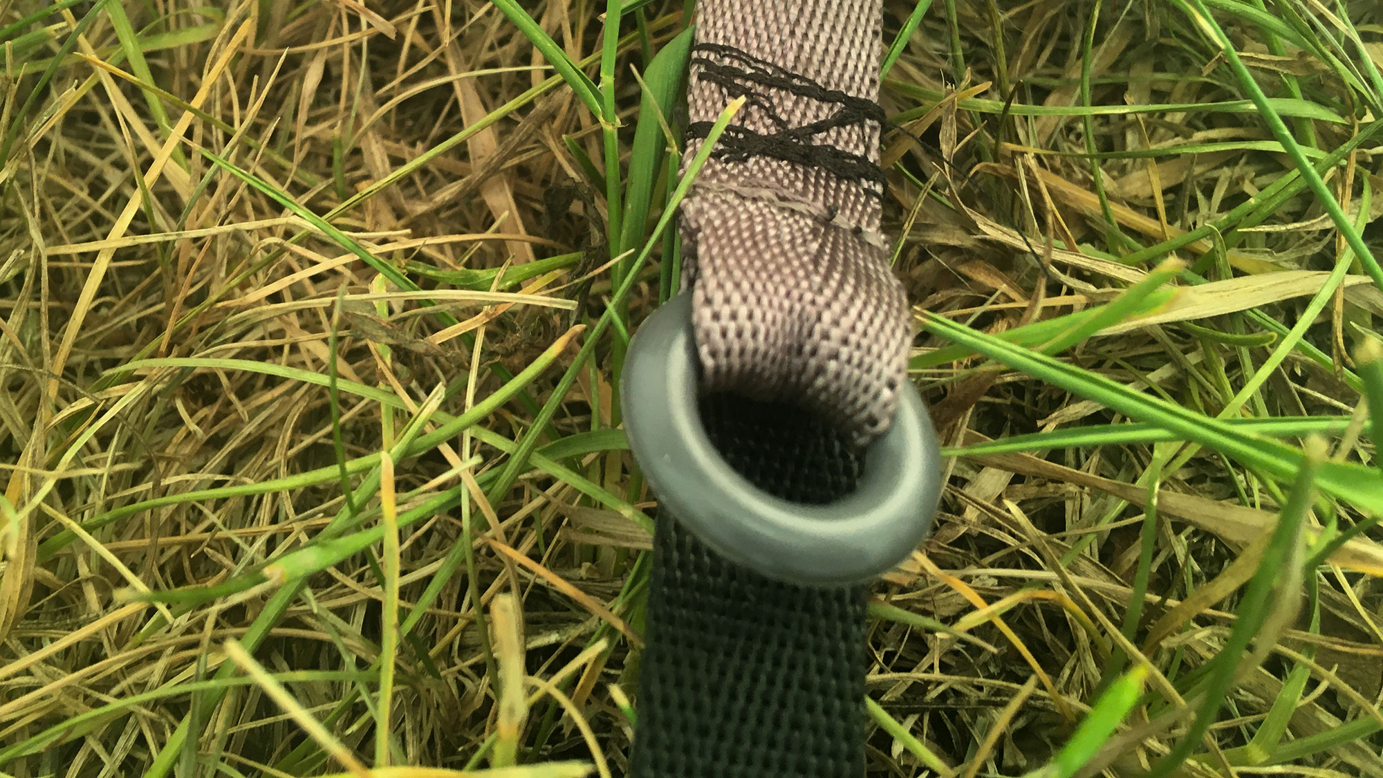 Am Außenzelt befinden sich die Bänder mit den Ösen zur Befestigung des Innenzeltes. An einer Seite das Band annähen, siehe Bild 5, dabei sollte der Ring oben liegen.