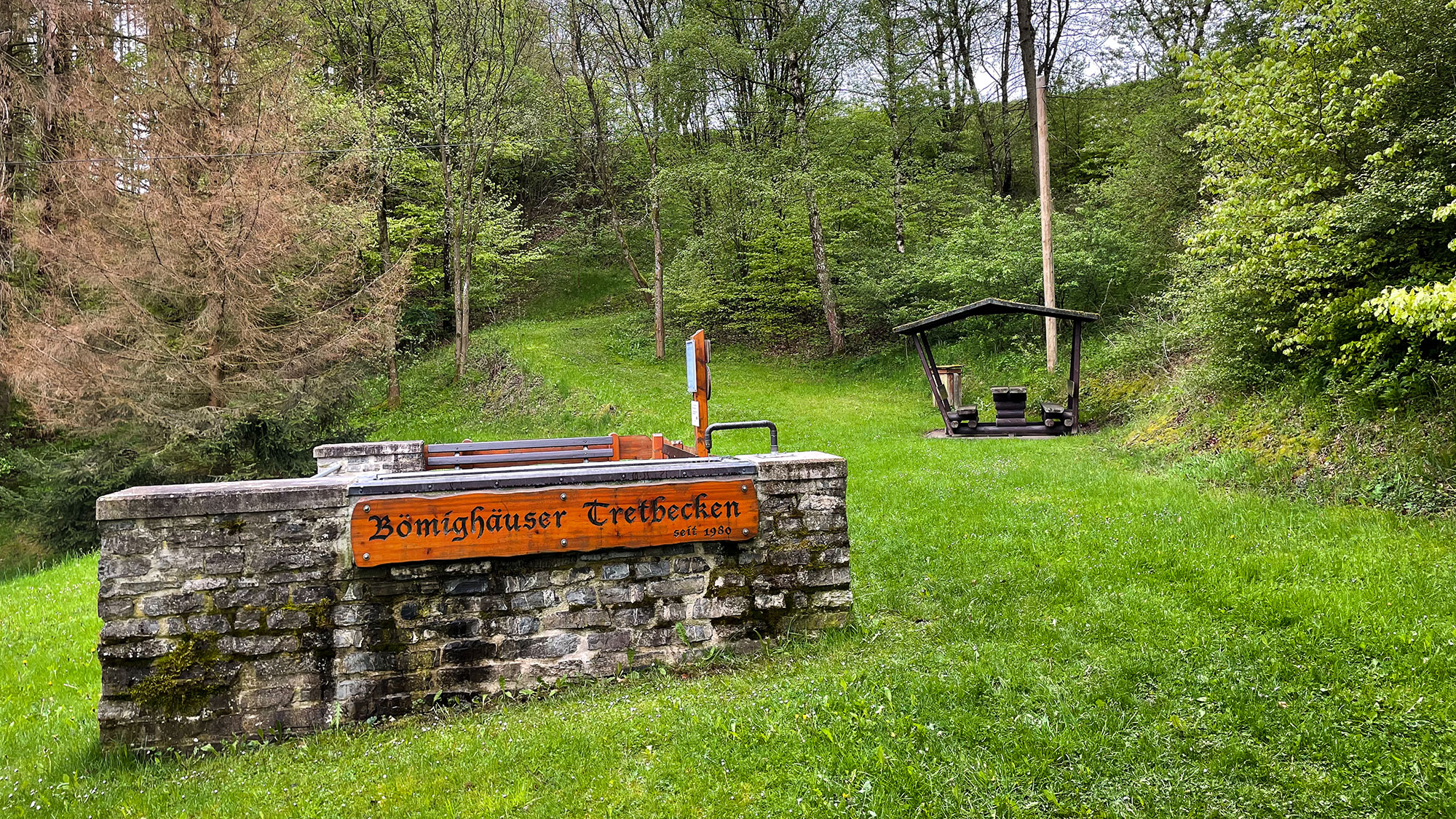 Parallel zum Flüsschen Needar und der Landstraße verläuft der Weg entspannt im Wald hindurch bis Bömighausen, wo wir auf eine Gruppe Ferienhäuser und eine Kneipanlage stoßen. Immer wieder kommt sie Sonne für ein paar Minuten durch und unsere Stimmung steigt.
