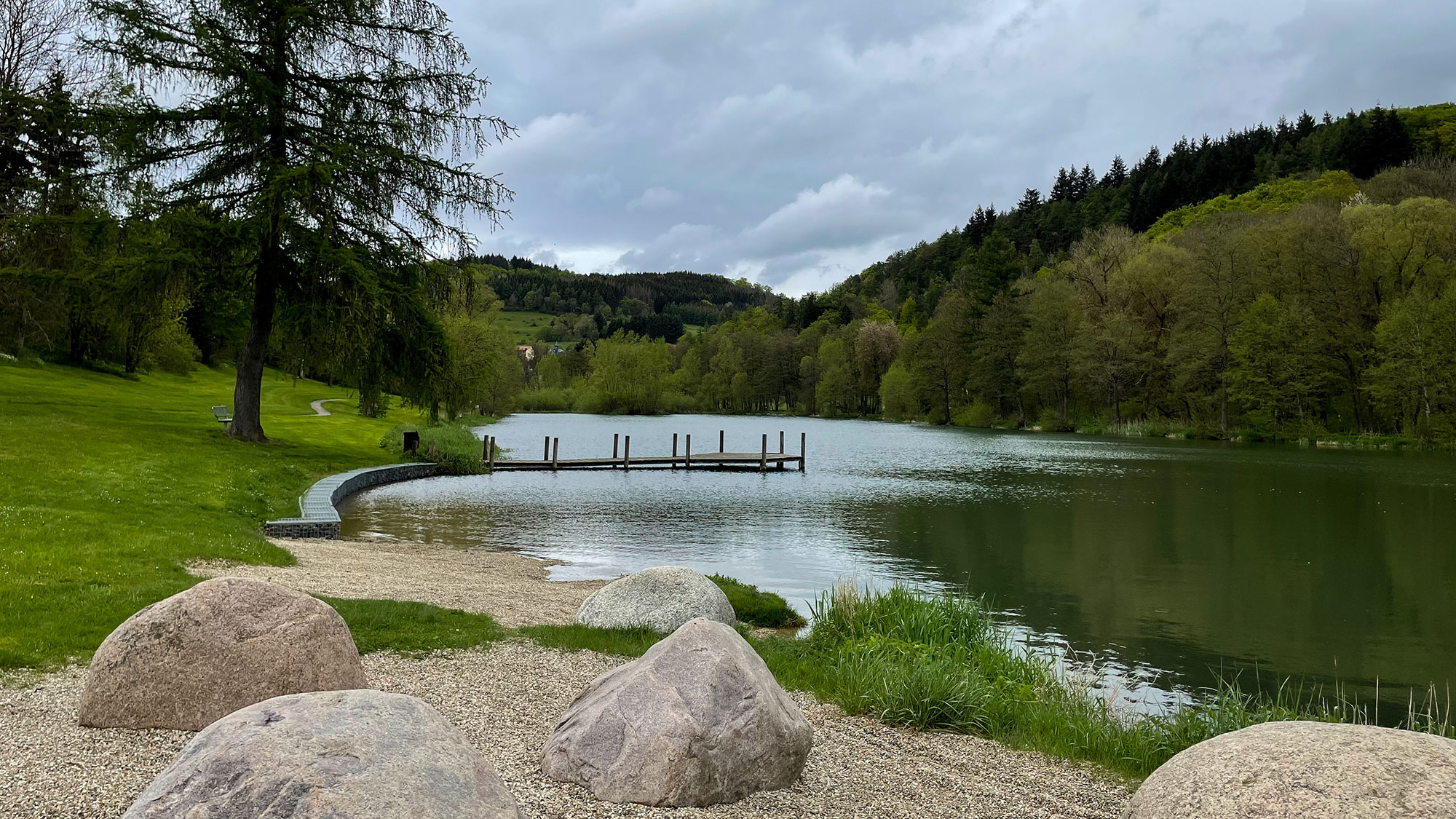 Der Weg führt oberhalb des Örtchens entlang, wir kommen an einer Wiese mit Kühen und ihren Kälbern vorbei, weiter unten sehen wir Familien mit Kindern, die spazieren gehen. Am kleinen Bömighauser See angelangt liegt der Campingplatz Bahrenberg, an dem wir unsere Wasservorräte auffüllen und die Toilette besuchen. Ein schöner Platz, ein ruhiger Platz, ein winziger See. Genau richtig für eine kleine Rast in der komfortablen Grillhütte, denn es regnet wieder, und Ju muss etwas essen. Nach einem Snickers und der kurzen Pause wollen wir weiter gehen, sonst rosten wir hier noch ein. Unser heutiges Ziel, den Trekkingplatz-Büller-Höhe  haben wir noch lange nicht erreicht.