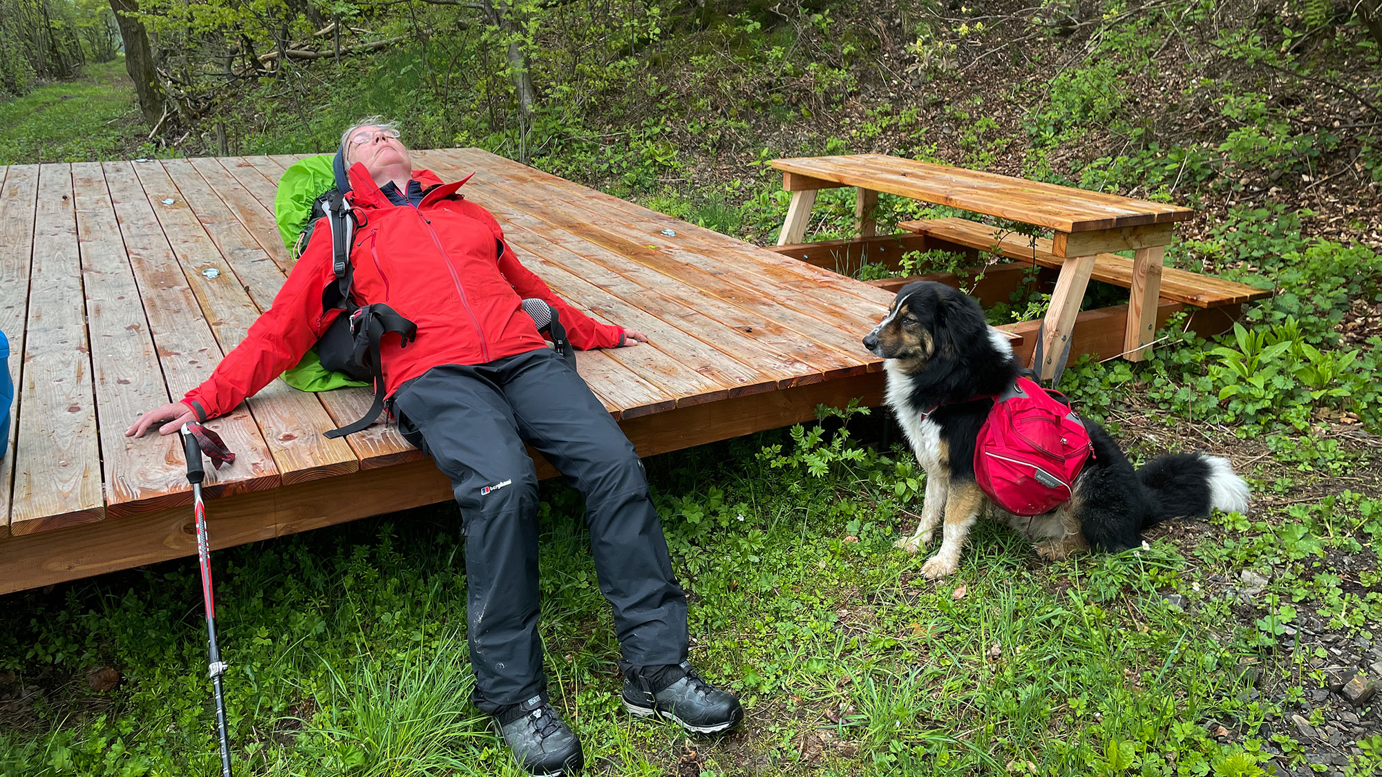 Eine Wanderfamilie kommt uns entgegen und ruft schon von weiten: „Und der Hund hat der auch einen Rucksack“, und beim näher kommen erkennen Sie dann Mozarts roten Rucksack und lächeln. Ansonsten treffen wir heute niemanden unterwegs, wir haben die Welt für uns.