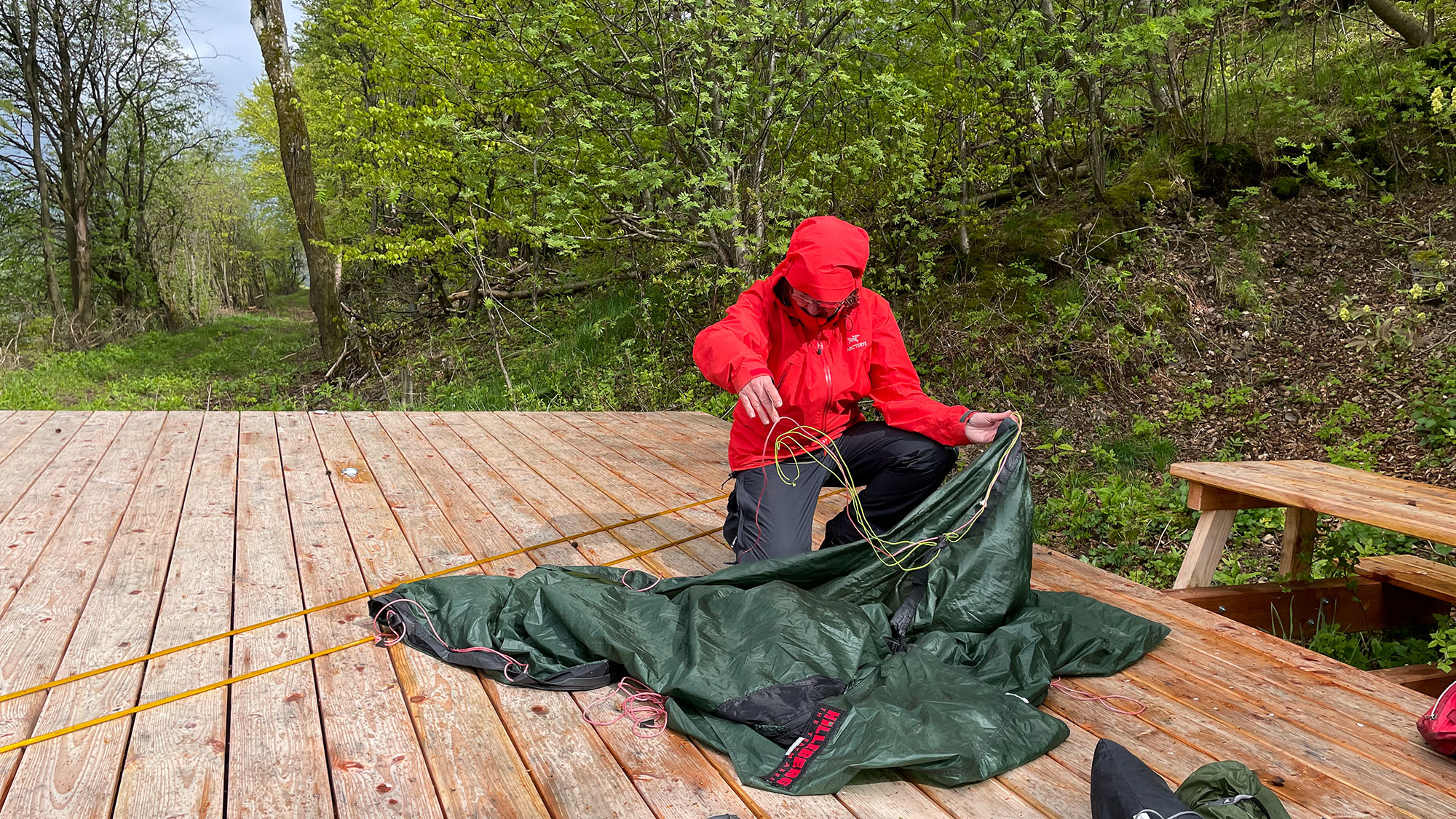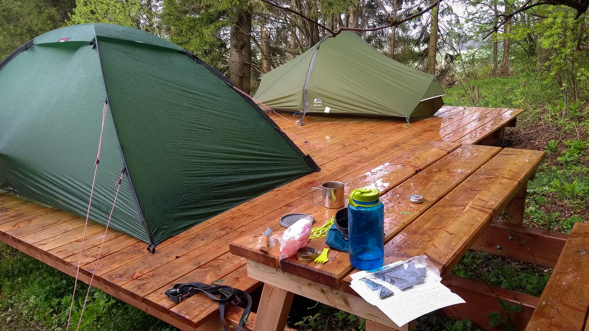 Mit Judiths Zelt wird es etwas schwieriger, denn es muss an den Längsseiten gespannt werden. Zum Glück haben wir zusätzlich Leine, um das Problem zu lösen. Etwas schwieriger wird es mit den je 2 Abspannpunkten an Kopf und Fußende, denn hierfür stehen keine Ringe am richtigen Platz zur Verfügung. Judith krabbelt teilweise unter die Plattform und wir wickeln die Schnüre um die Holzplanken. Unsere Rucksäcke stehen derweil trocken in der Komposttoilette.
