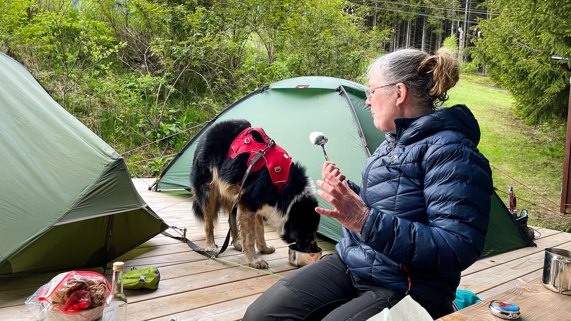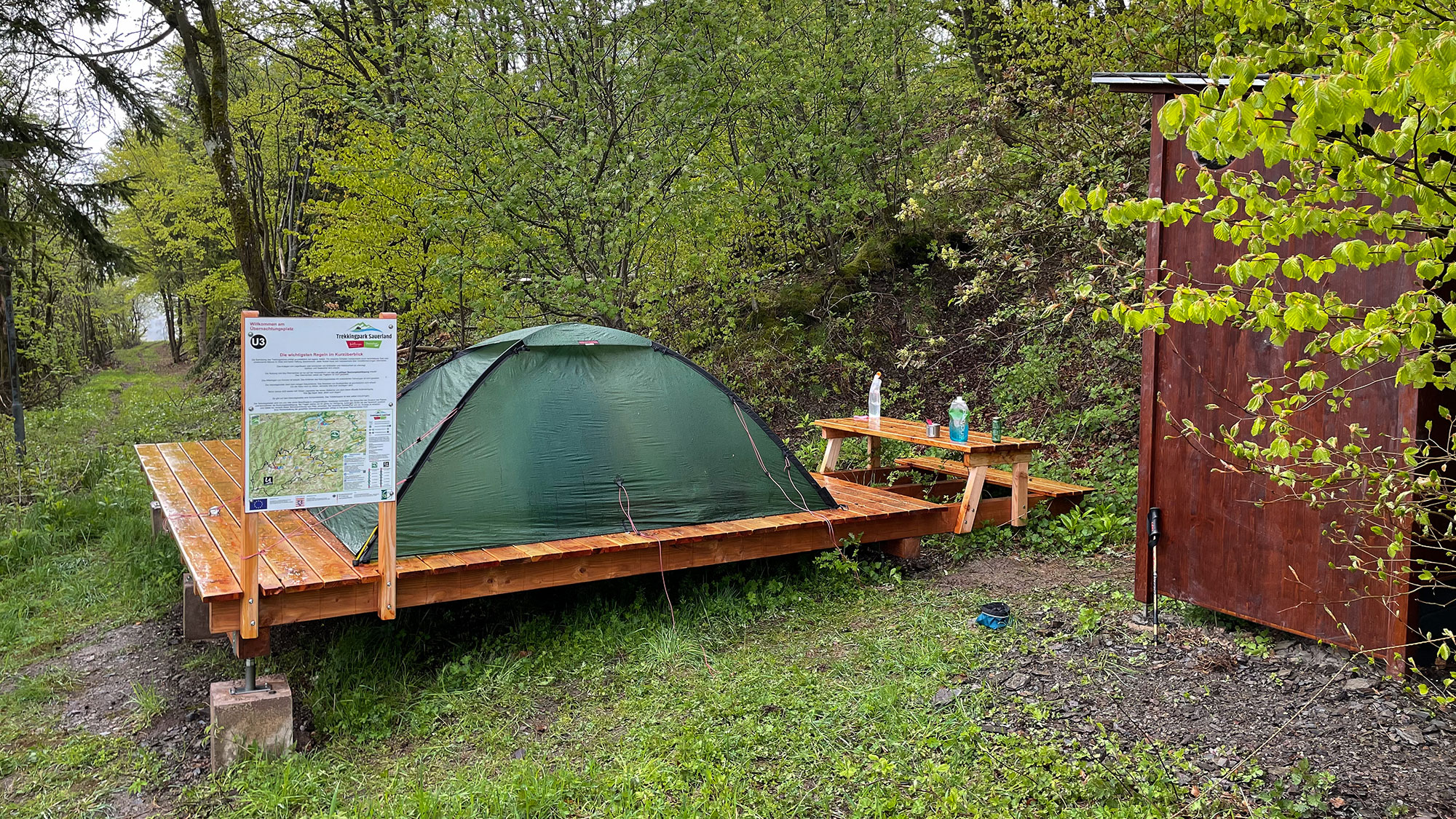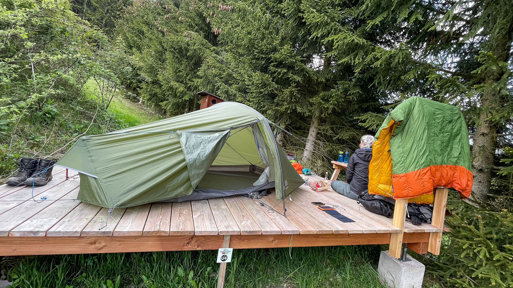 Aber zuerst werden die Zelte aufgebaut, diesmal klappt alles reibungslos und ich habe die Idee die Seiten des Tunnelzeltes mit Heringen zu befestigen die ich in die Lücken zwischen den Planken schiebe. Natürlich ganz vorsichtig und ohne das Holz zu beschädigen. Auch mein Daunen Quilt bekommt in der Zwischenzeit etwas Wärme und Luftzufuhr, denn der nasse Hund hat doch einige feuchte Spuren am Tag zuvor hinterlassen.