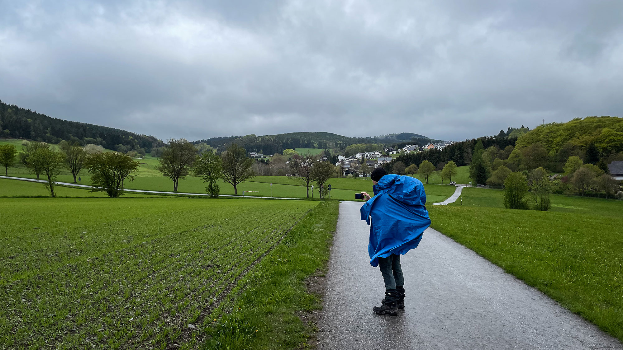 Zum zweiten Mal rutschen wir den Hang runter und entsorgen unseren Müll. Der Wind weht kräftig aus genau der Richtung, in die wir nun gehen müssen. Unsere Augen tränen als wir oberhalb von Usseln den Weg in Richtung Diemel Quelle einschlagen.