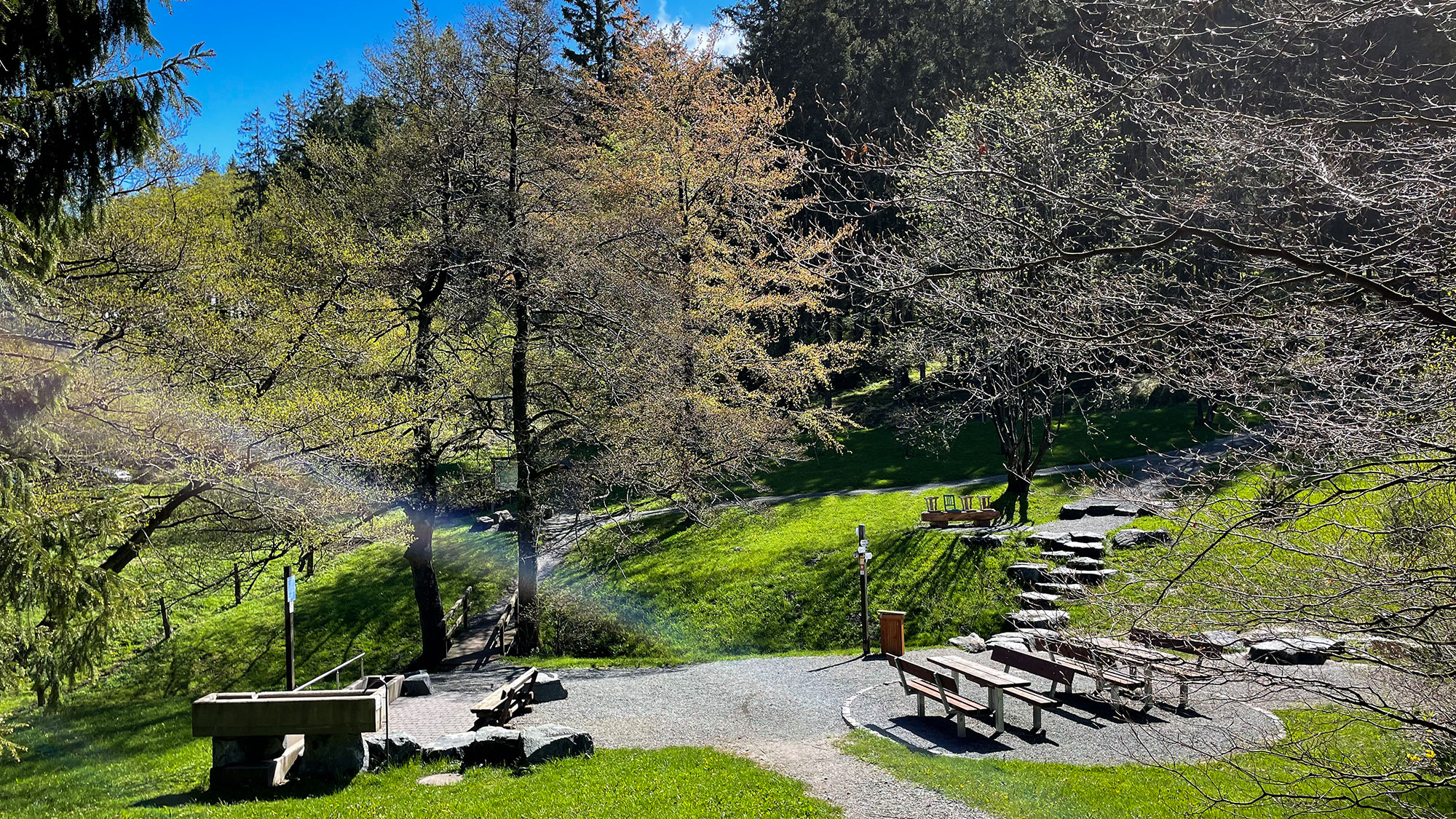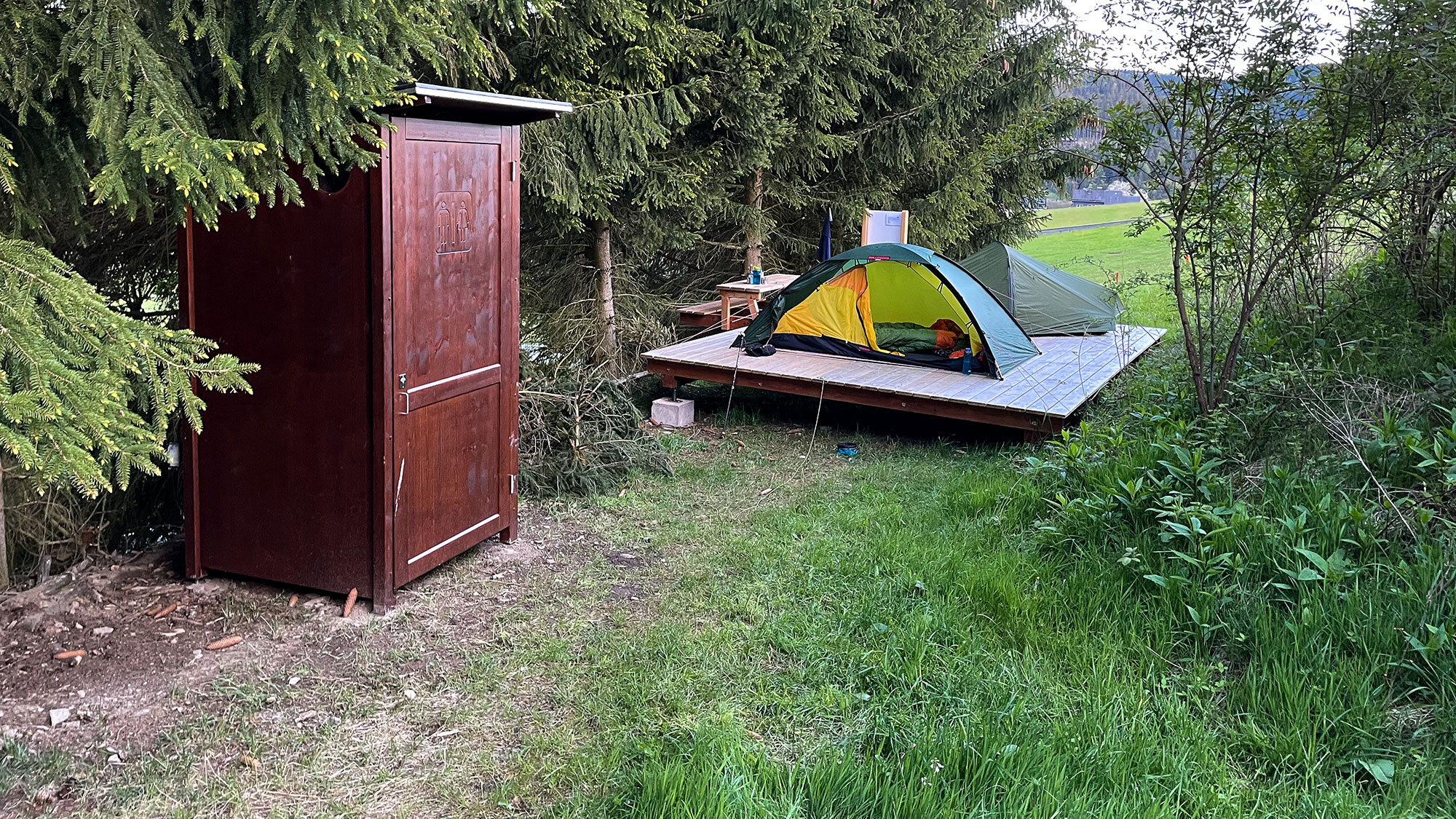Wenige Minuten später finden wir unsere Holzplattform am Hang oberhalb der Sommerrodelbahn, ein bisschen versteckt zwischen vereinzelten Bäumen. Und die Sonne scheint Juhuu! Unser Wunsch geht in Erfüllung, wir können heute Abend, an dem an der Platform montierten Holztisch unser Abendessen einnehmen.