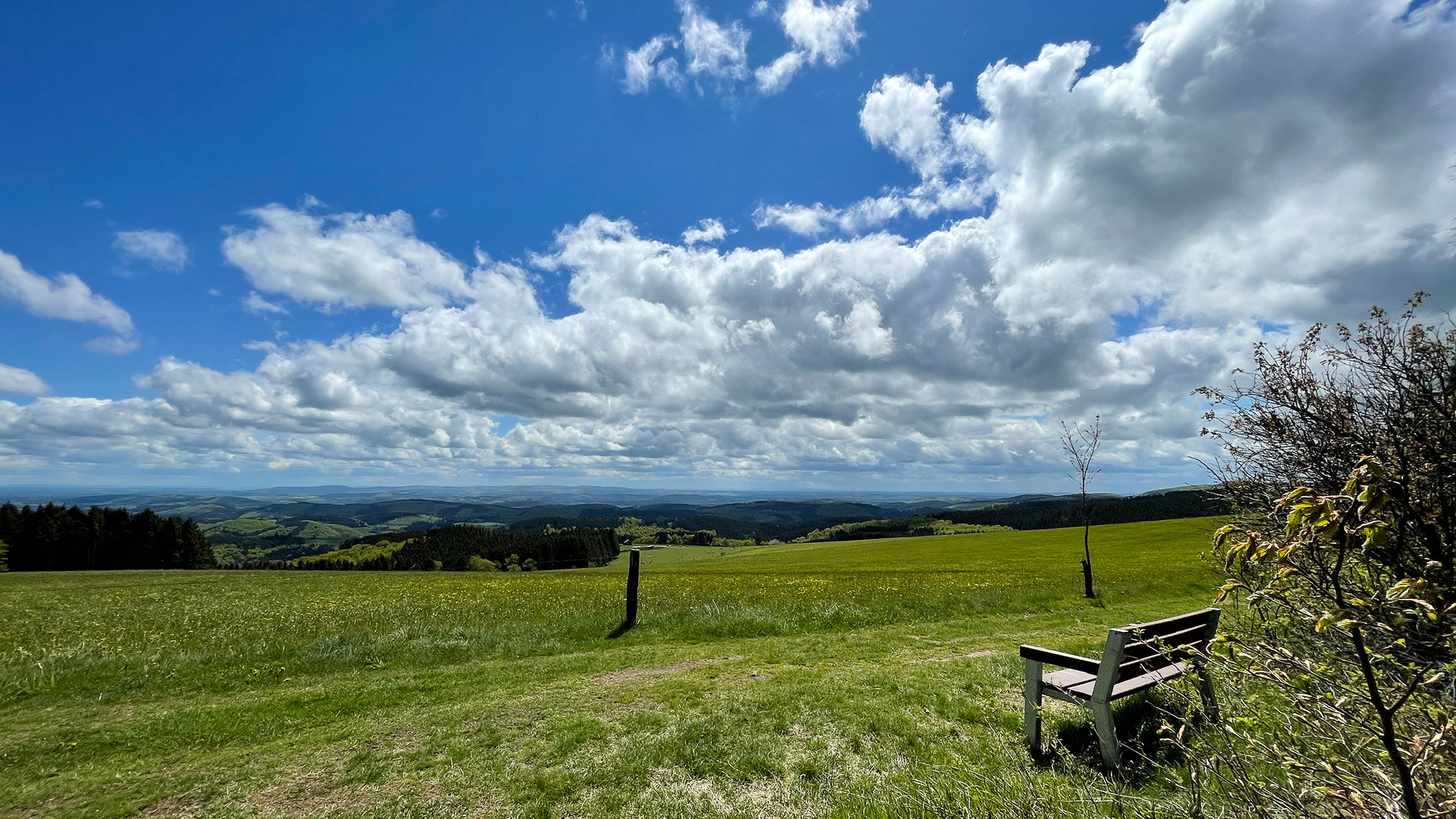 Am übernächsten Knick im Weg haut es uns um und auf die nahegelegene Bank. Die Karte sagt Tepels Kohlhagen, wir finden die Aussicht einfach nur Mega, Mega! Eine Karte vom Sauerländer Höhenflug zeigt die Namen aller Erhebungen im sichtbaren Bereich, es sind viele und so weit, weit weg! Und weil die Aussicht so Besonders war, gibt es jetzt besonders viele Bilder.
