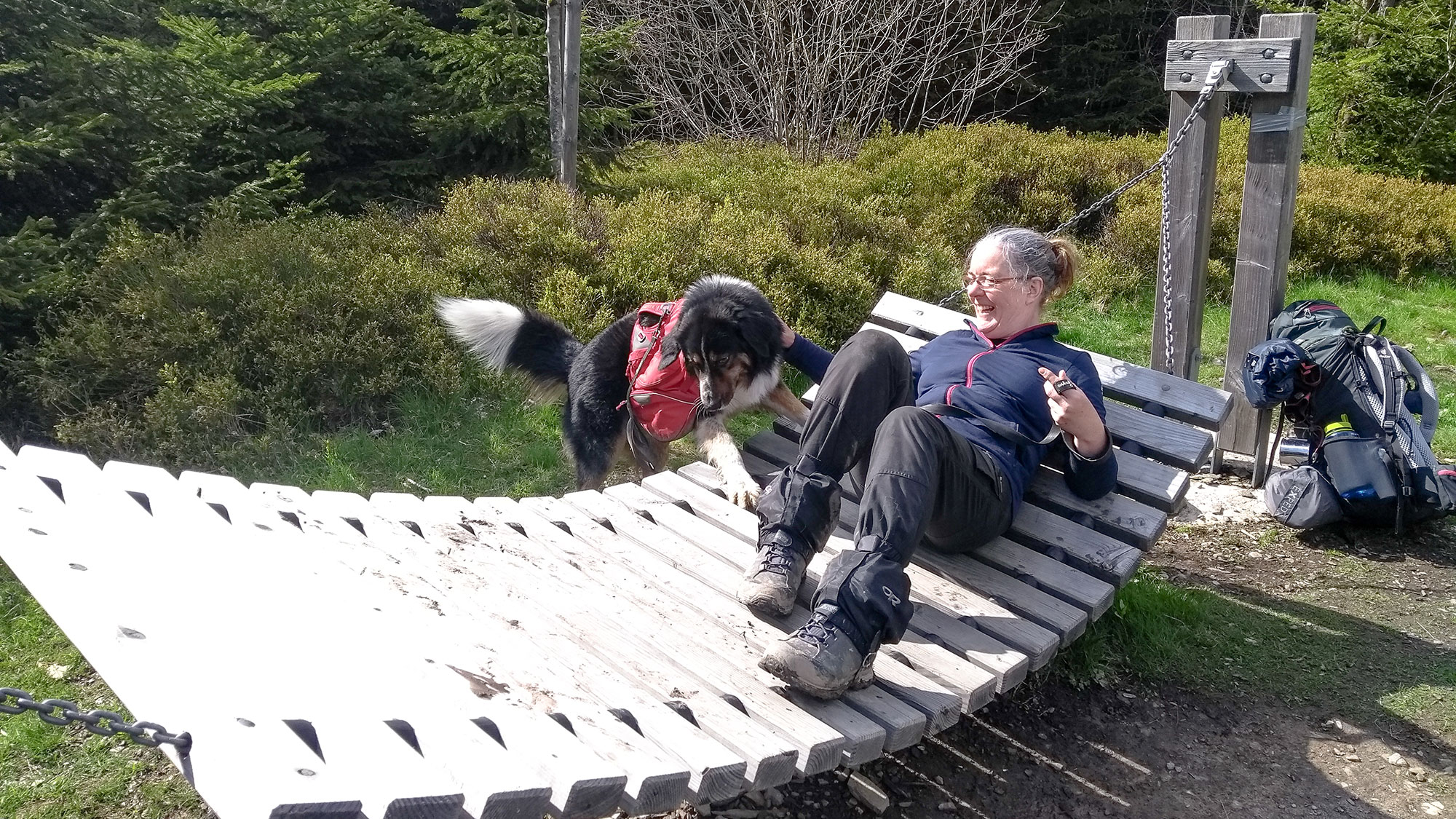 Judith findet, dass der Rucksack heute gut auf den Rücken passt, ich auch. Das schöne, kalte Wetter ist ideal für einen Wandertag. So liebe ich es, und anscheinend auch einige andere Wanderer, denen wir heute begegnen. Voll vergessen, es ist Pfingsten! Die nächste Hütte mit Aussicht wird von einer Familie belegt, wir genießen kurz das Panorama und stiefeln weiter, immer leicht bergan, aber easy und gut zu gehen.