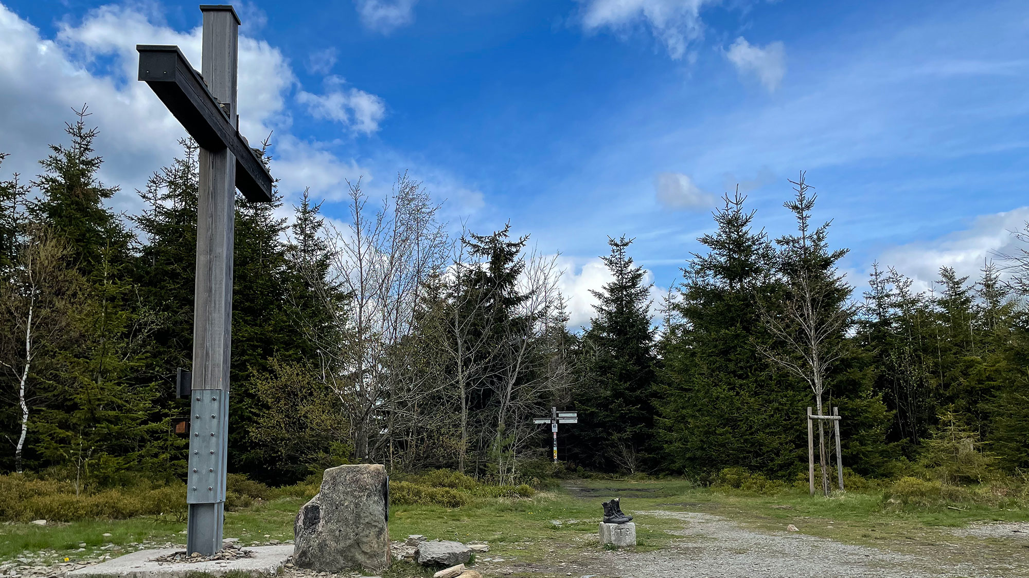 Weiter geht es durch den Wald und etwas passiert mit mir, die Endorphine machen sich breit meine Stimmung ist im Höhenflug. Das letzte Stück bis zum Langenberg geht es noch ein wenig bergauf, aber das macht mir überhaupt nichts aus. Als wir endlich auf dem unscheinbaren Platz, der höchsten Erhebung Nordrhein-Westfalens ankommen, wirft Judith ihren Rucksack auf die Erde und schmeißt sich auf die hölzerne Hängematte und johlt. Irgendein Witzbold hat alte lederne Wanderschuhe auf einen Stein gestellt, ansonsten gibt es hier nur noch ein Kreuz und eine Gedenktafel und ringsherum Bäume. Kein obligatorischer Aussichtsturm! Gefällt mir!