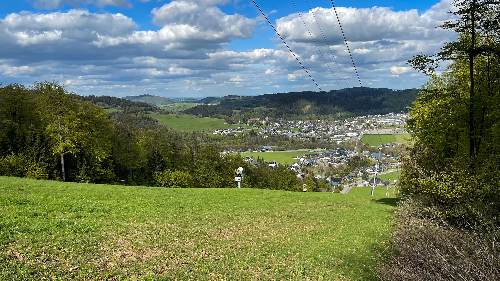 Nur noch schlappe 4 km fehlen uns bis zum Erreichen des Trekkingplatz-Ritzhagen-Willingen. Es geht bergab und Judiths Knie macht sich bemerkbar. Schneller als gedacht erreichen wir eine große Liftstation. Ein Schild weist uns den Weg zum Trekkingplatz-Ritzhagen-Willingen die Piste hinunter.