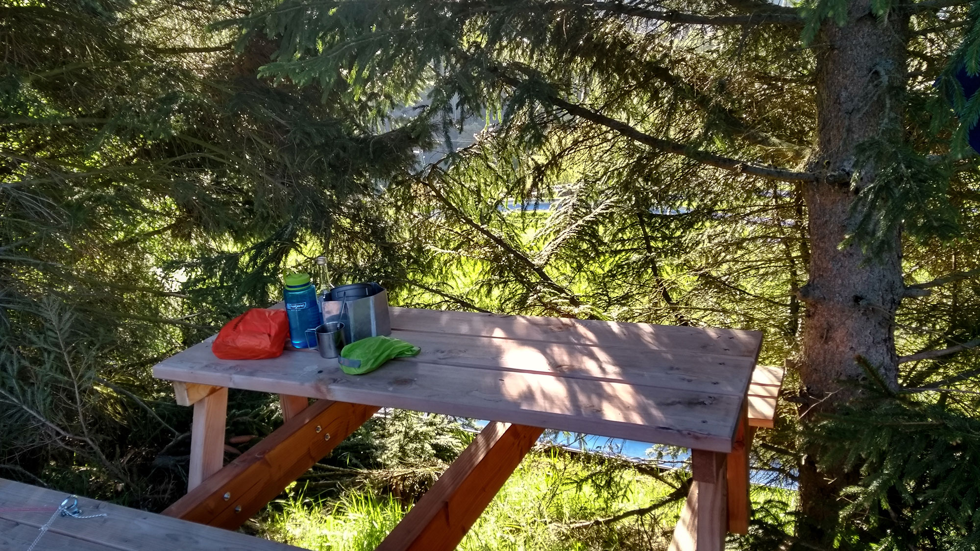 Durch meine Abbruch Aktion ist es jetzt bereits nach 18 Uhr, und eine kurze Regenpause ermöglicht mir einen raschen und trockenen Aufbau. Isomatte und Quilt ins Zelt und dann schnell vor dem nächsten Guss zur Hütte und den obligatorischen Tee zubereiten. Danach Wasser erhitzen für meine Tütennahrung und das Futter für Mozart. Beides kurz aufquellen lassen und danach wird gespeist. Wir verbleiben nur noch eine Weile in der Hütte, hören den Vögeln zu, die in jeder Regenpause sofort wieder mit dem Singen beginnen und gehen dann zum Zelt, wo sich das Konzert fortsetzt. Eine Kuschelrunde mit Mozart und schon sind wir eingeschlafen.