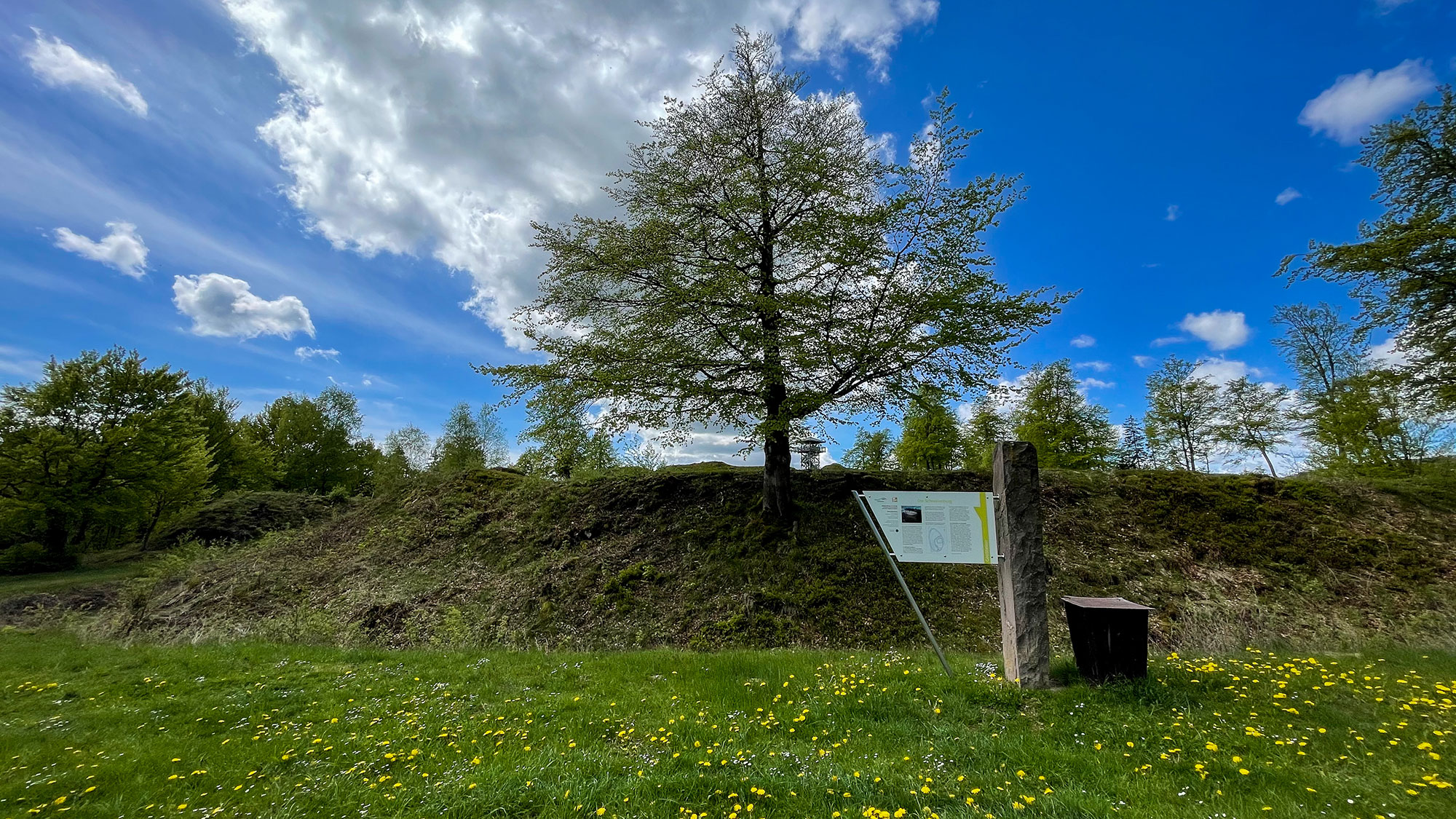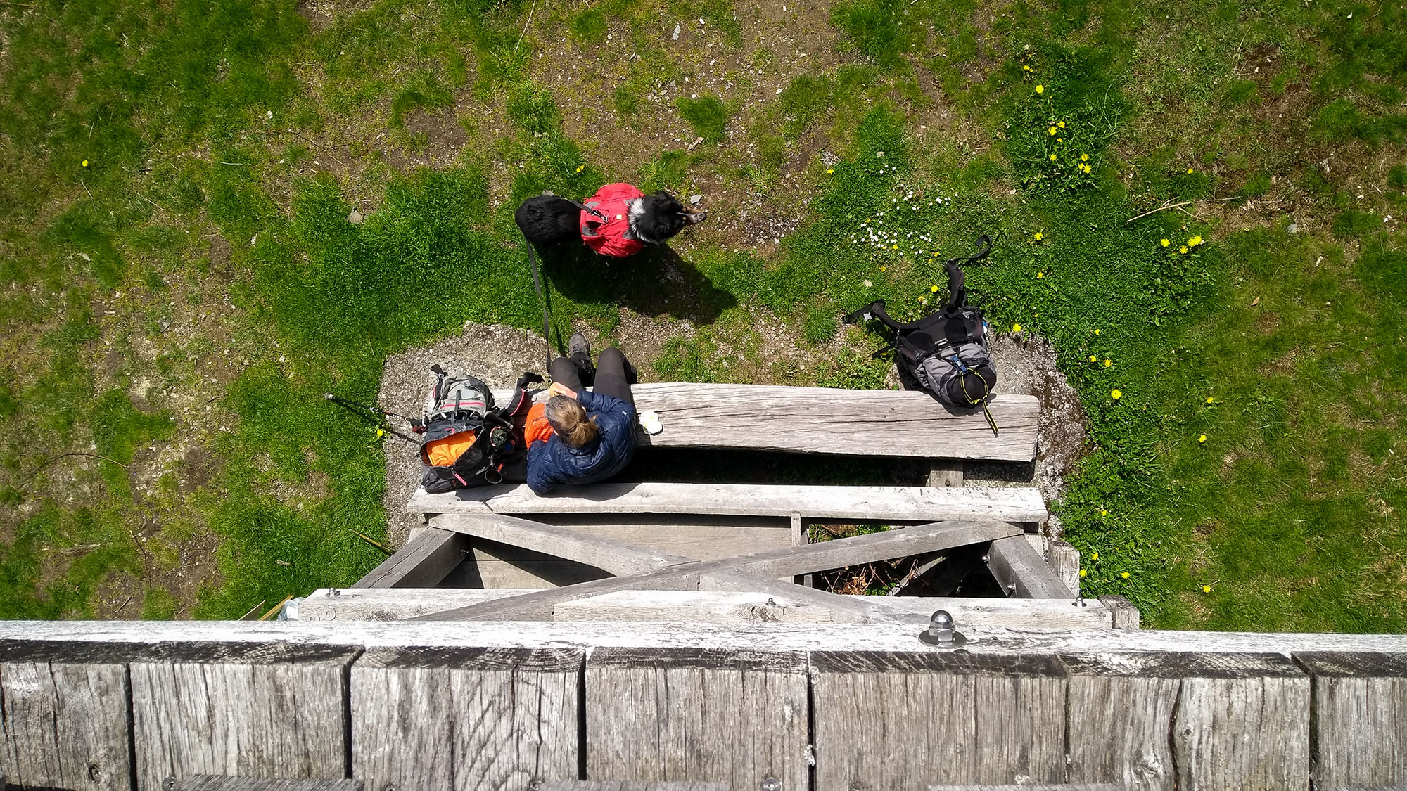 Im Zentrum der Anlage steht ein hölzerner Aussichtsturm. Ich muss da nicht rauf, es reicht mir zu sehen was ich sehen kann mit meinen 1,68 Metern. So genieße ich ganz einfach die Sonnenstrahlen, einen Snickers, und horche den Geräuschen aus der Vergangenheit zu. Immer wieder tauchen Menschen auf, die Mozart sofort anbellt, sobald sie zu nahekommen. Hütehund, typisch. Dabei hat er mehr schiss vor Fremden als diese jemals vermuten würden.