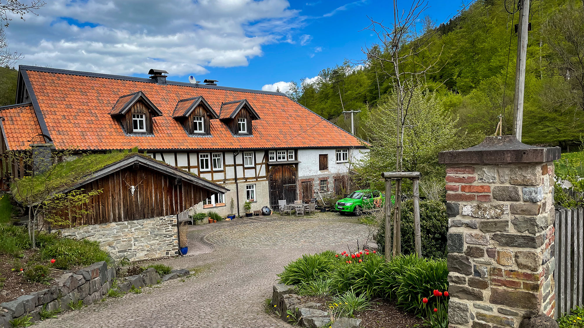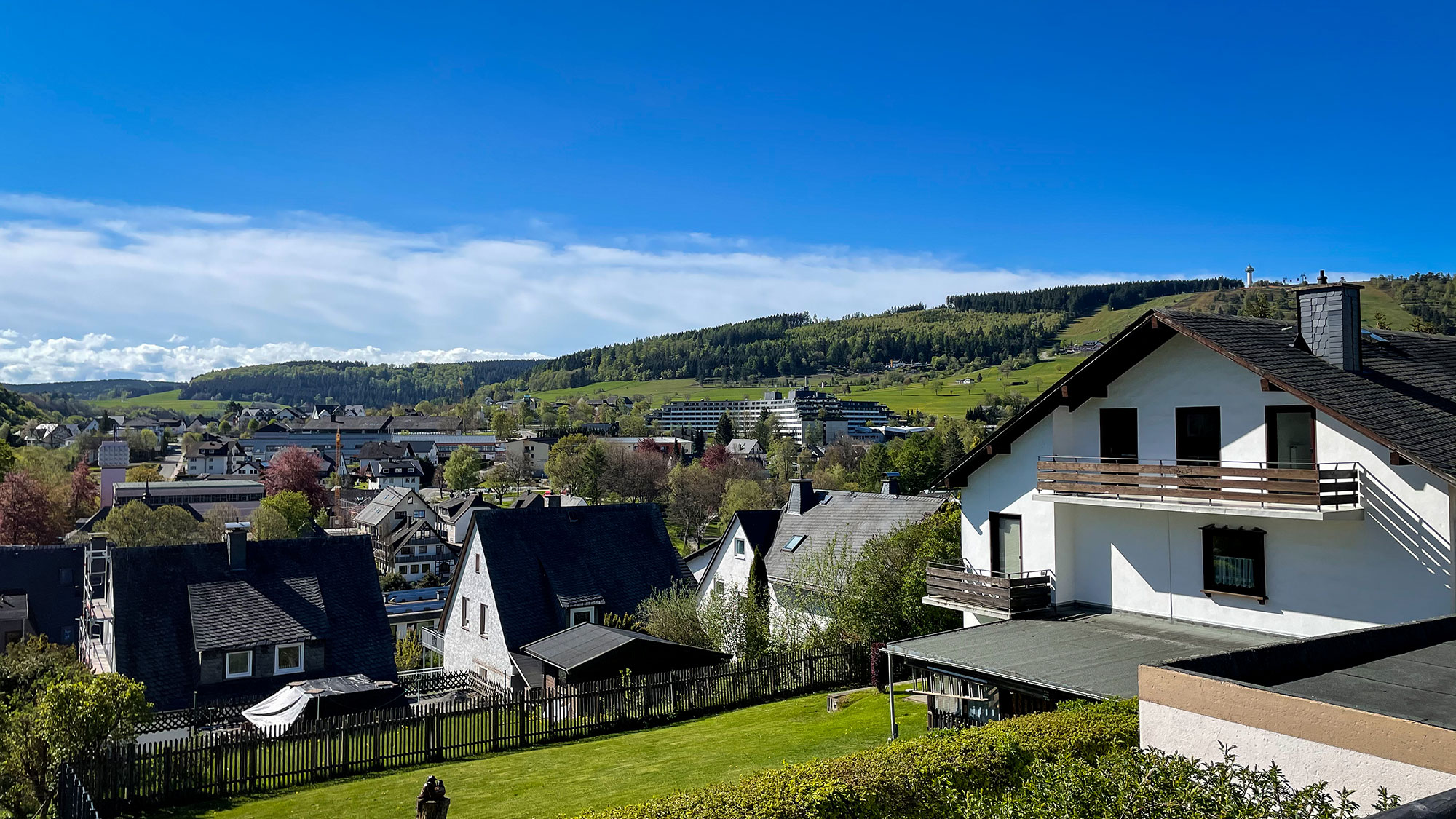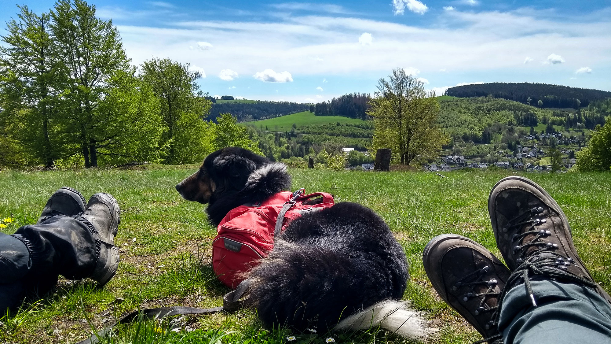 Während ich noch mein Porridge verspeise, steht Ju schon in der Sonne und wartet auf den Aufbruch. Das kommt davon, wenn man mit jemandem unterwegs ist, der am Morgen nur einen Kaffee trinkt. Auch Mozart muss noch gesattelt werden und dann ziehen wir die Piste hinunter nach Willingen. Ein kleines Stück vom Uplandsteig haben wir so ausgelassen, aber egal, so genau nehmen wir die Streckenführung nicht.