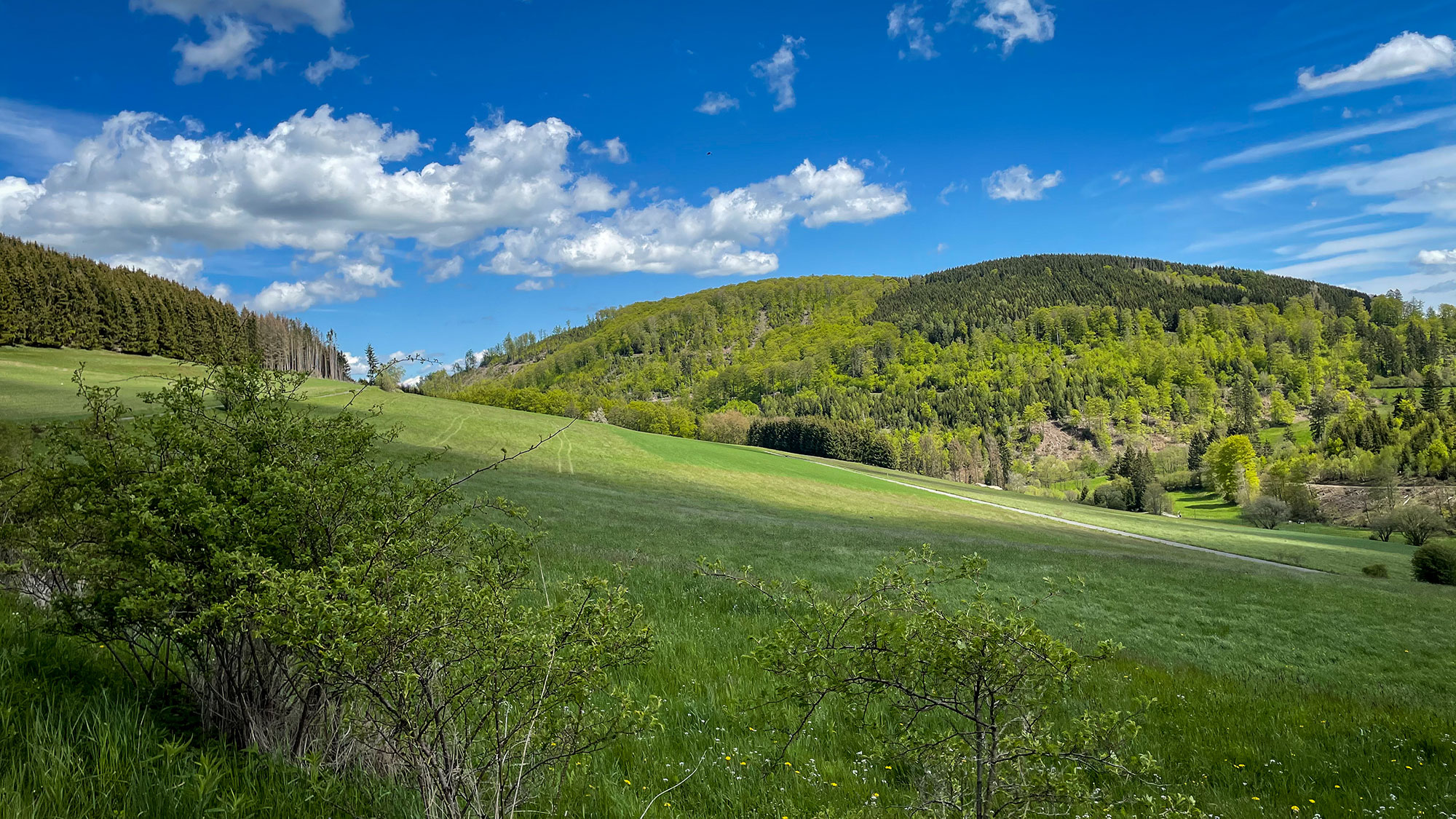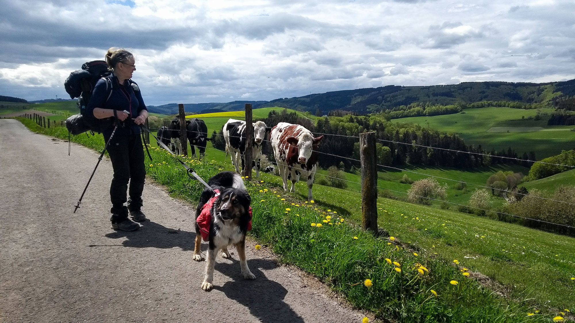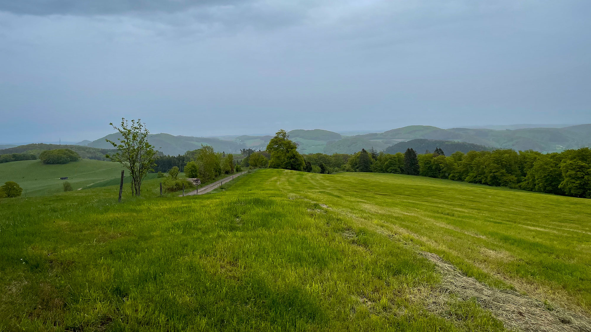 Der Weg führt nicht nach Schwalefeld hinein, sondern zwischen den Wiesen nördlich und südlich mit 2 senkrechten Abstiegen die Wiesen hinunter, was für Ju’s Knie nicht angenehm ist. Dort wo das Tal sich verengt, müssen wir über den nächsten Hügel, und beim Anblick der fast senkrechten 45 Grad Steigung auf einem schnurgeraden Weg ahnt uns was kommen wird.