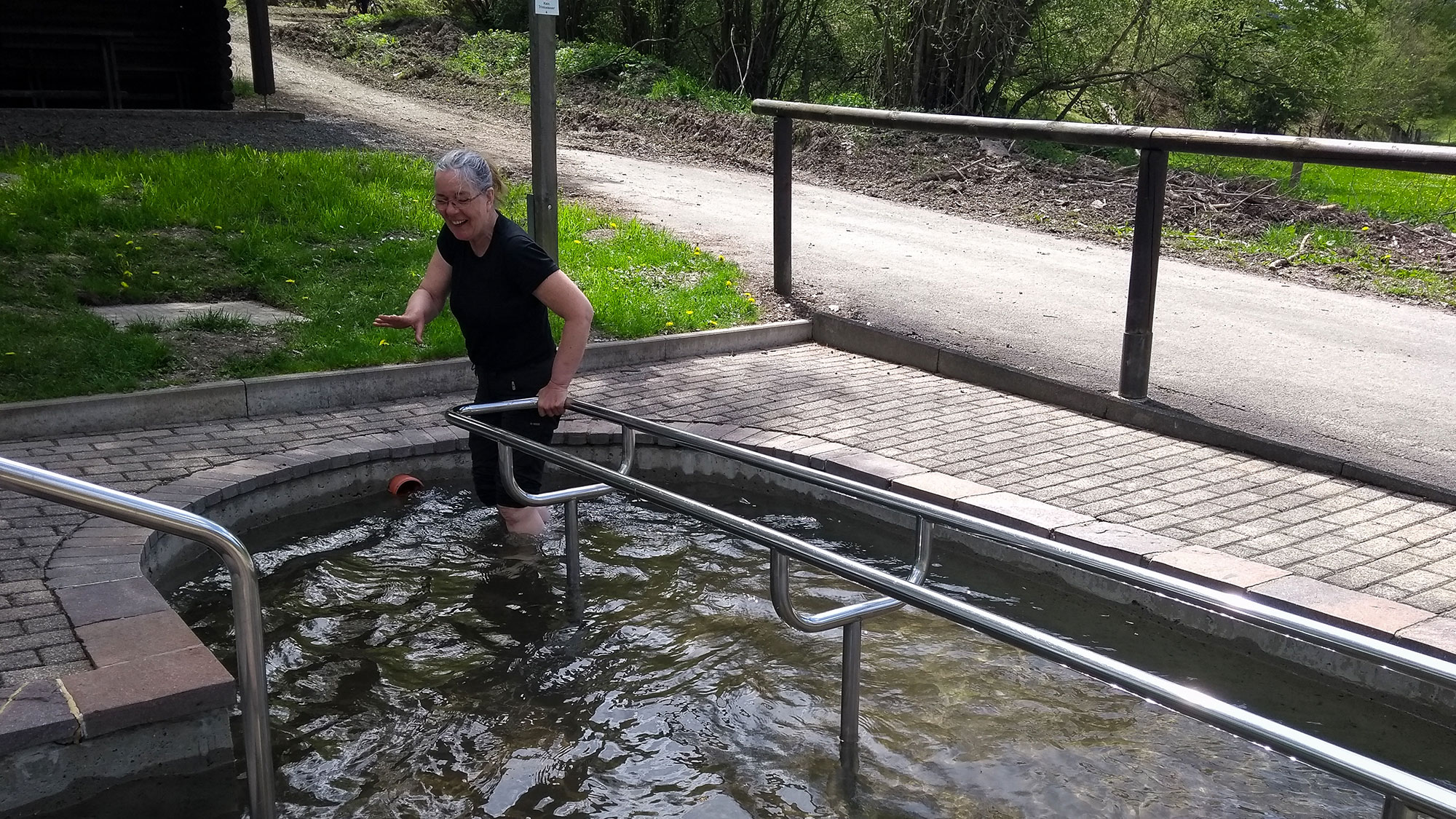 Vorher möchte ich Mozart am Bach etwas trinken lassen und sehe dabei, dass hier in der Kneipp Anlage Wasser ist. Ju will nicht, na dann ich auch nicht, entweder alle oder keiner. Also will Ju doch. Sie bekommt leider ihre Wanderhose nur bis unterhalb der Knie hochgezogen, bei mir geht mehr. Und so bleibt sie auf der kurzen Treppe und ich gehe, begleitet mit Jauchzern und Schreien einmal rundum durch das eiskalte Wasser. Danach sind unsere Füße, aber auch unsere Gehirne bereit für den folgenden Weg hinauf nach Rattlar.