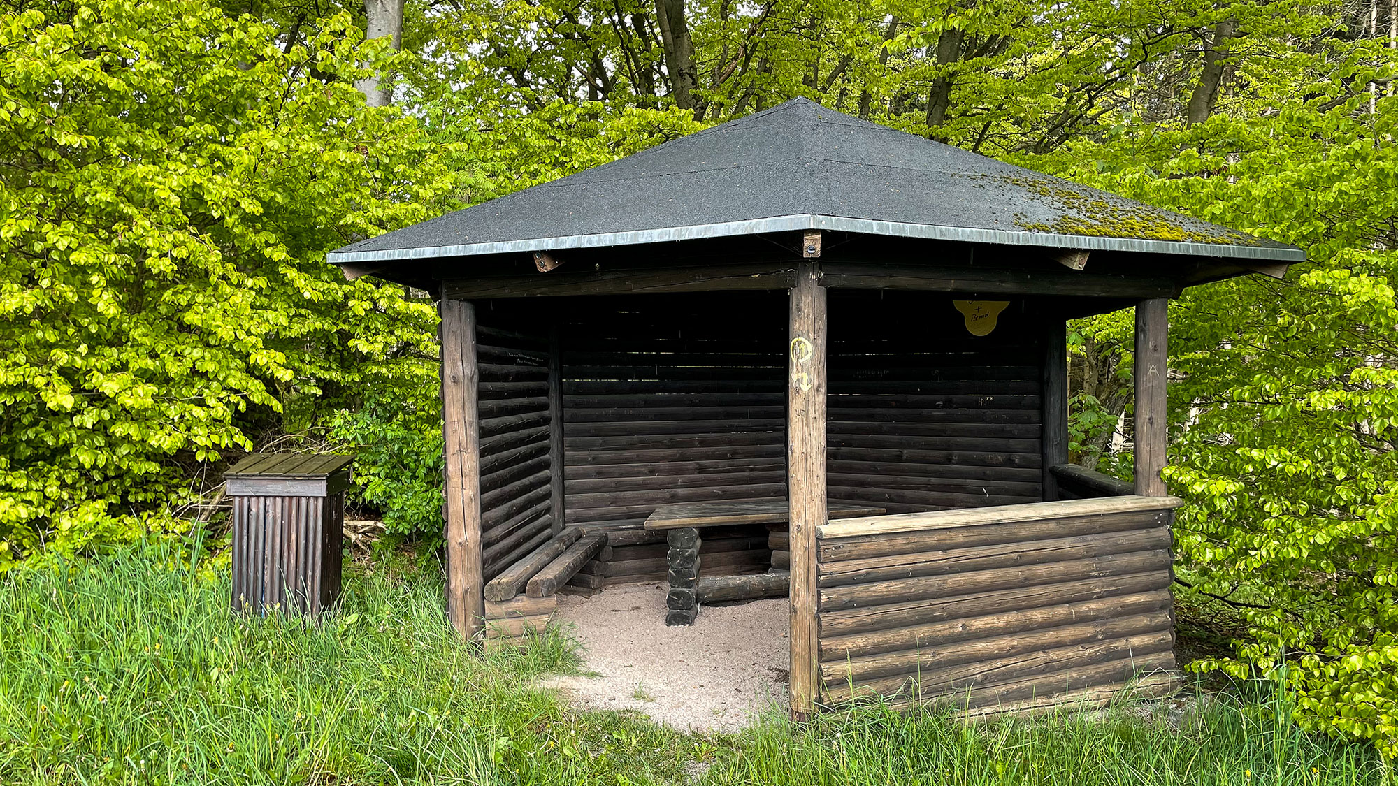 Nach einem kurzen Anstieg sind wir oben angekommen und haben einen herrlichen Blick über das Aarbachtal. Wir entdecken hier den Trekkingplatz Schwalenburg bei Schwalefeld mit einer Schutzhütte. Toller Platz! Ich will hier auch mal mein Zelt aufschlagen, und zwar mit Enkelin. Vielleicht im August. Mit ihr könnte ich dann in der Burgruine am Abend Ritter und Burgfräulein spielen, oder einfach Backgammon, oder ein Kartenspiel. Heute jedoch haben wir noch ein Stück Wegzu gehen, es wartet der Trekkingplatz-Schutzhütte-Strombruch auf mich.